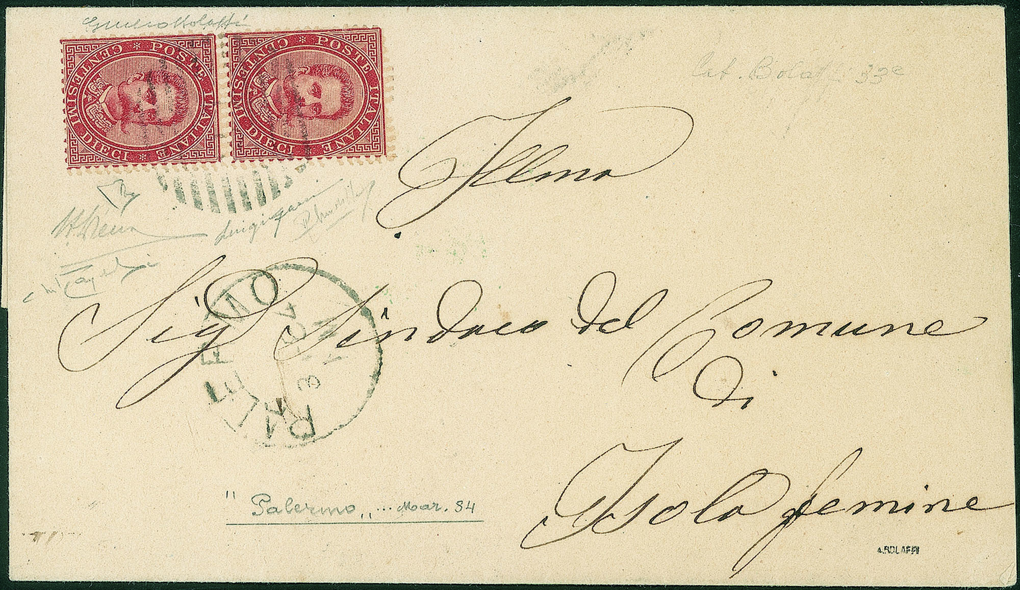 Regno - Umberto I - Splendida lettere da Palermo 3.84 per Isola delle Femmine affrancata con coppia verticale del 10 cent (38d)Doppia dentellatura - pezzo unico e raro - firma Bolaffi +L. Gazzi + E. Diena + Mondolfo - cert. A. Diena + Raybaudi