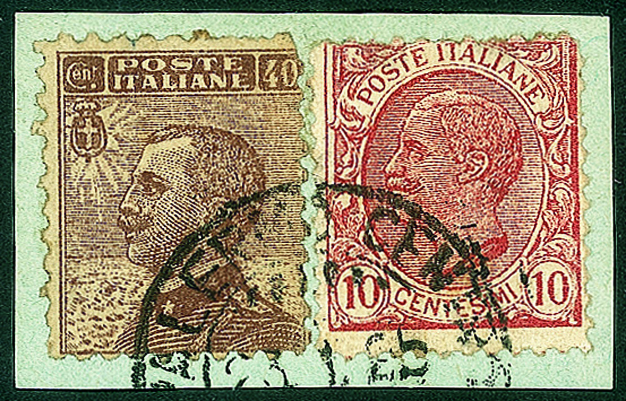 Lot 328 | Regno - Vittorio Emanuele III - Frammento recante due falsi dell'epoca da 40 + 10 cent (F82 + F84)
