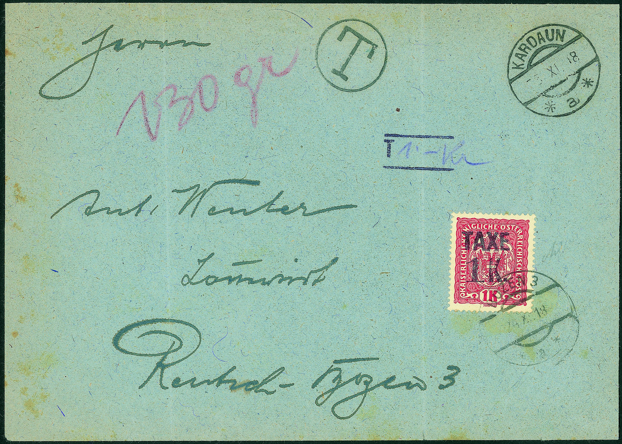 Occupazioni I guerra mondiale - Trentino-Alto Adige - Busta da Kardaun 23.11.18Tassata con 1 su 1 k. (BZ3/74) - cert. Avi