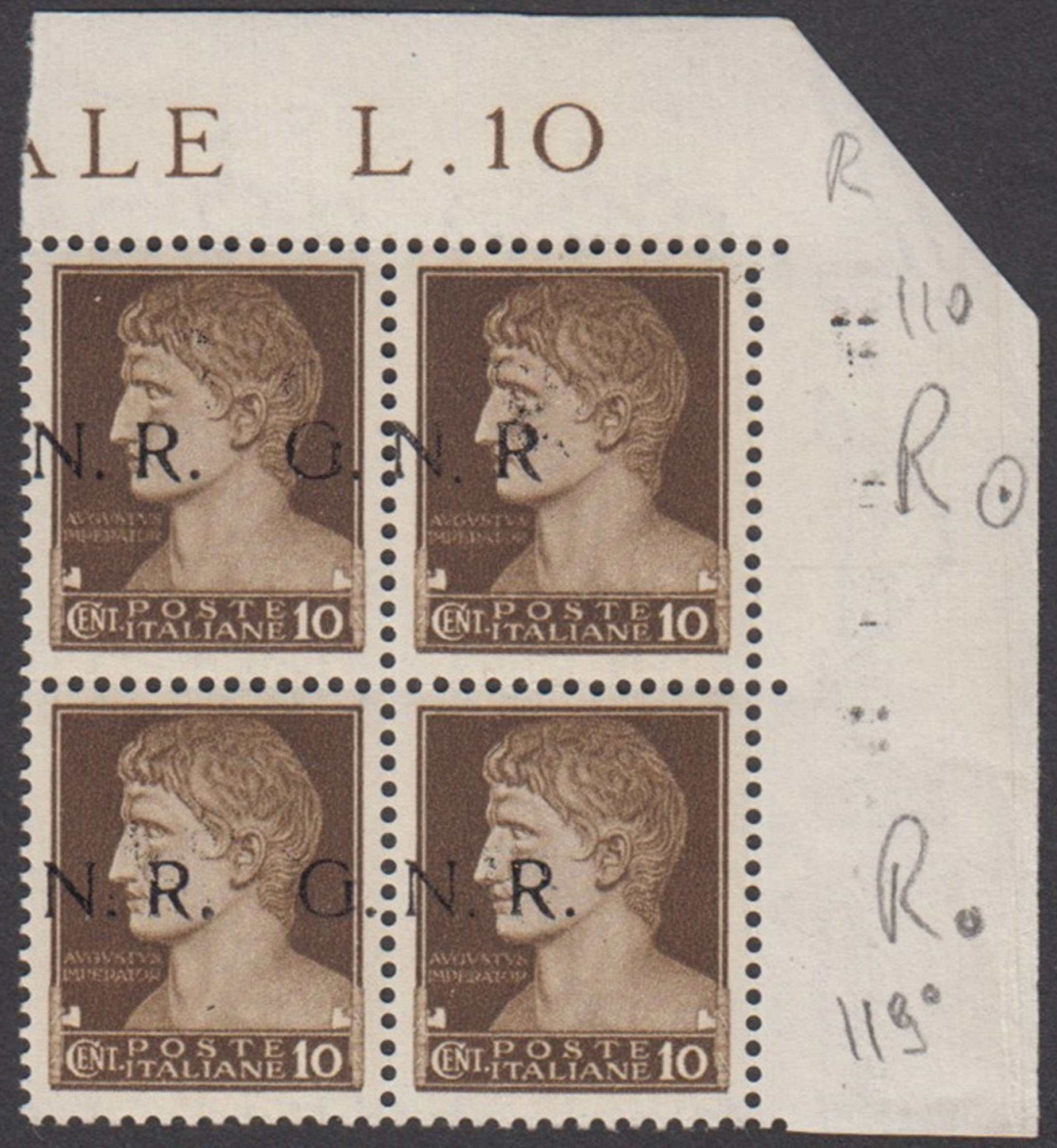 RSI - G.N.R. Brescia - 10 cent (471/Ip)1943 - GNR Brescia - quartina del 10 cent angolo di foglio - senza punto dopo R - molto bella - gomma originale integra - (471/Ip)