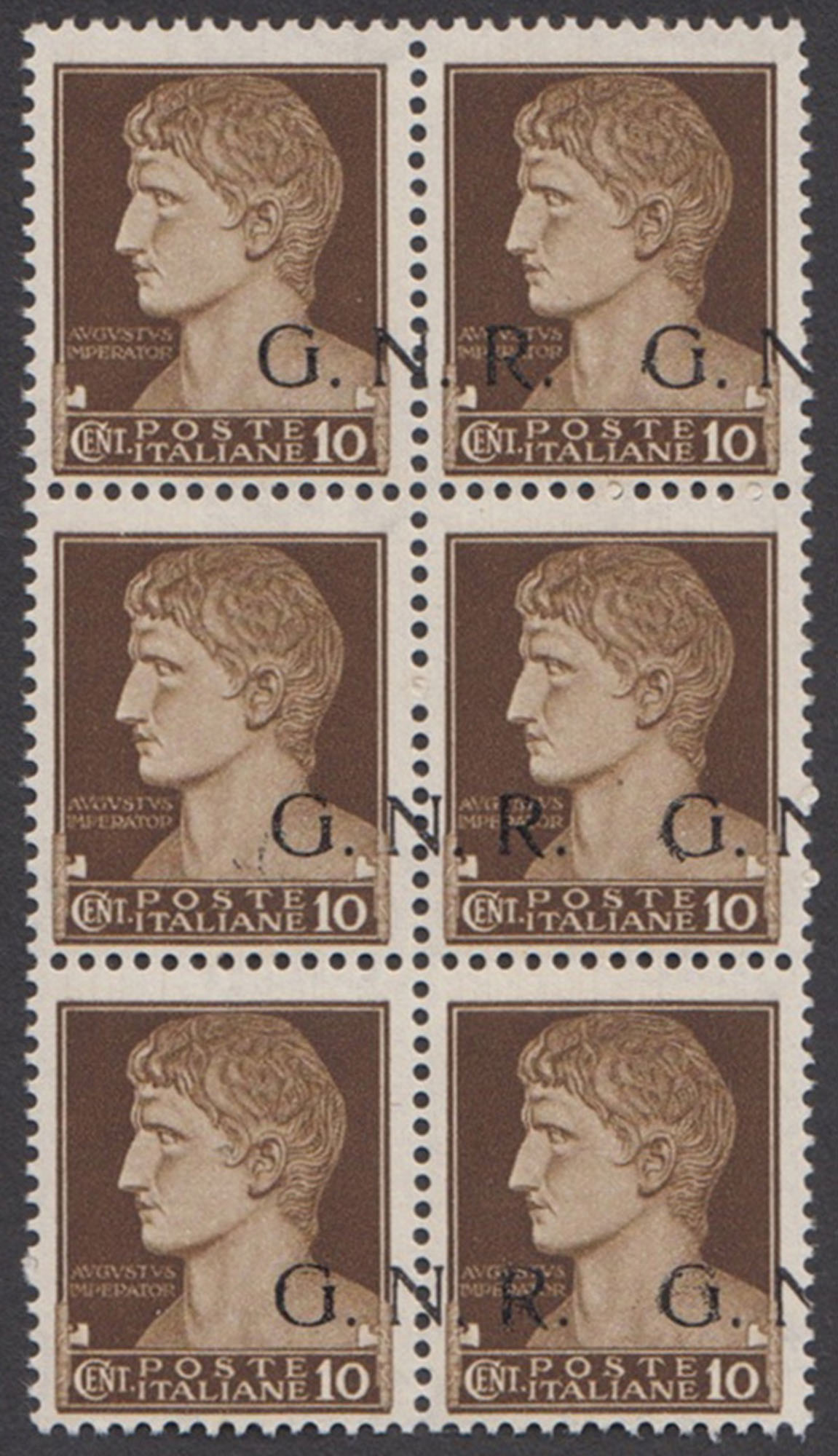 RSI - G.N.R. Brescia - 10 cent (CEI 2/Ie)1943 - GNR Brescia - Blocco di sei del 10 cent con soprastampa spostata GN + R - N a cavallo della dentellatura - gomma originale integra - (CEI 2/Ie)
