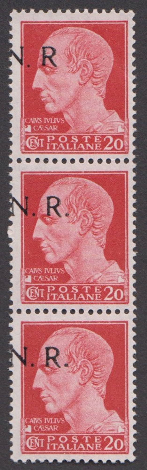 RSI - G.N.R. Brescia - 20 cent (473/Ii)1943 - GNR Brescia - Striscia verticale di tre del 20 cent con soprastampa in alto e N a cavallo più R senza punto (errore ia) - gomma originale integra - (473/Ii)