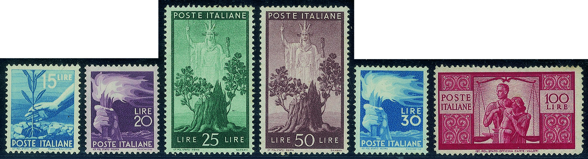 Repubblica - 1946/1947 - Democratica (543/565)Serie completa gomma integra - cert. Oliva per il 30 e 100 lire