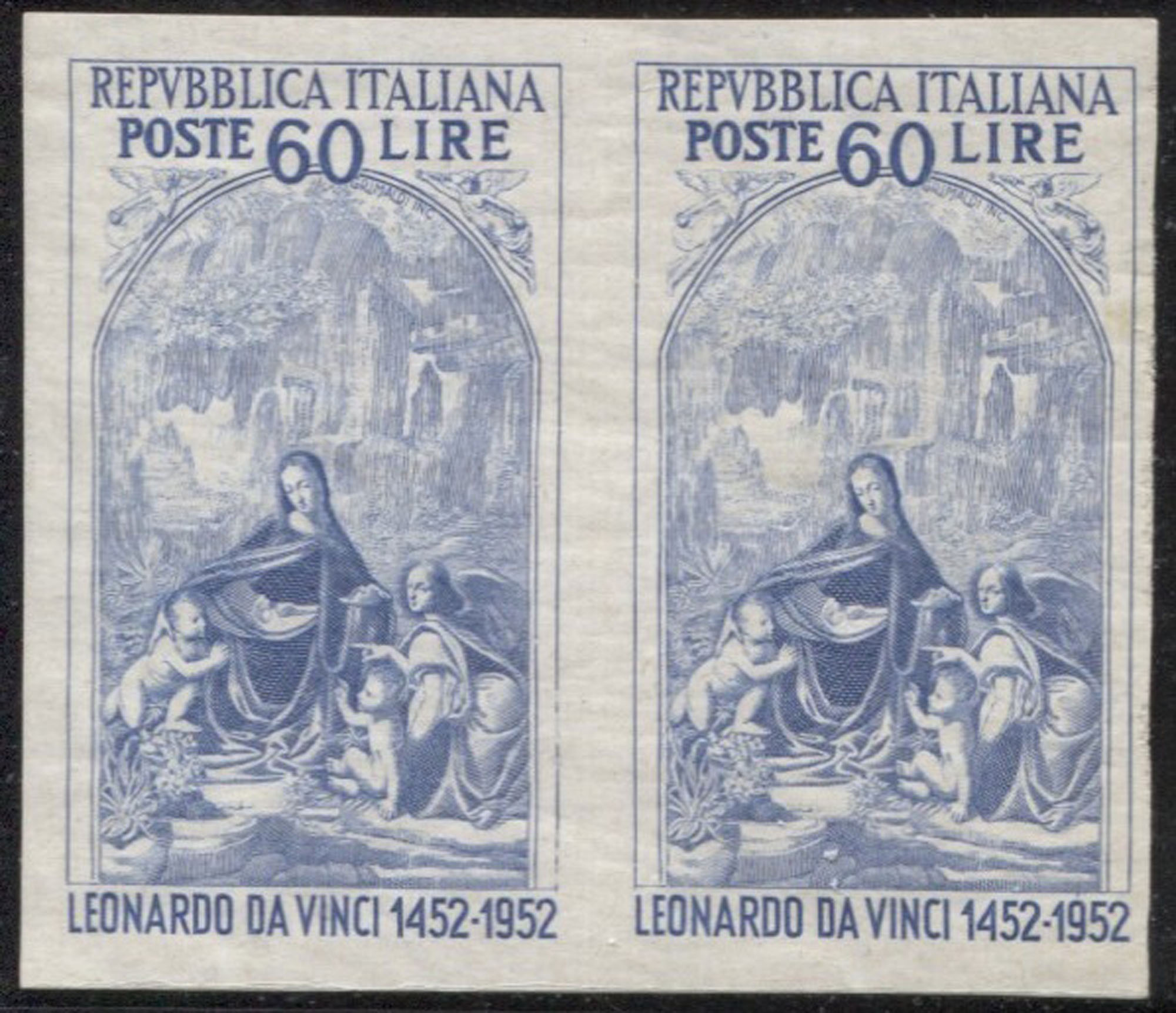 Repubblica - 60 lire (687b)1952 Repubblica - 60 lire Leonardo da Vinci coppia orizzontale non dentellata - cert. ED - (687b)