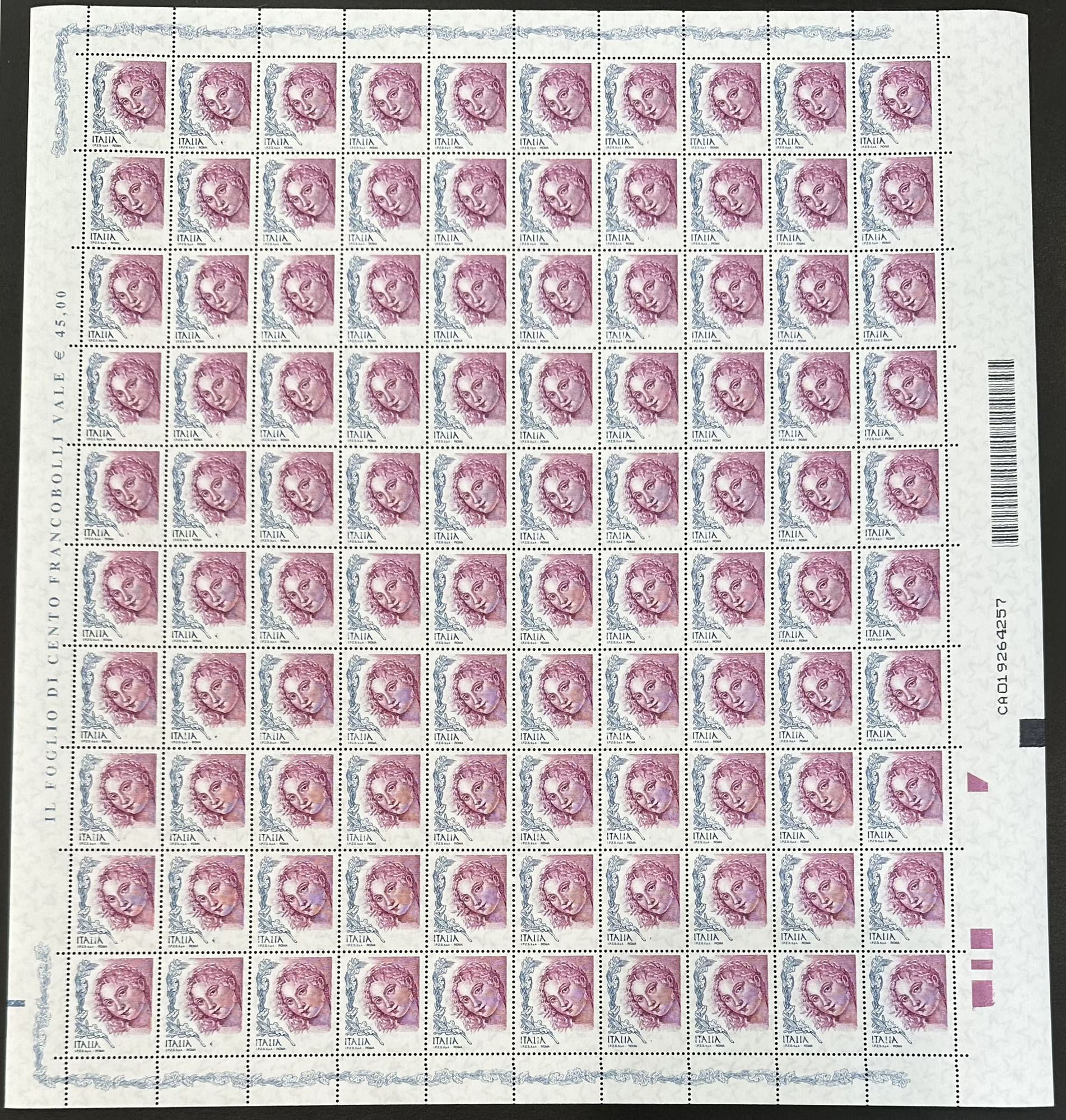 Repubblica - Donna nell'arte (2726 varietà)Donna nell'arte foglio completo di 100 es. senza la stampa della cifra - (2726 varietà)