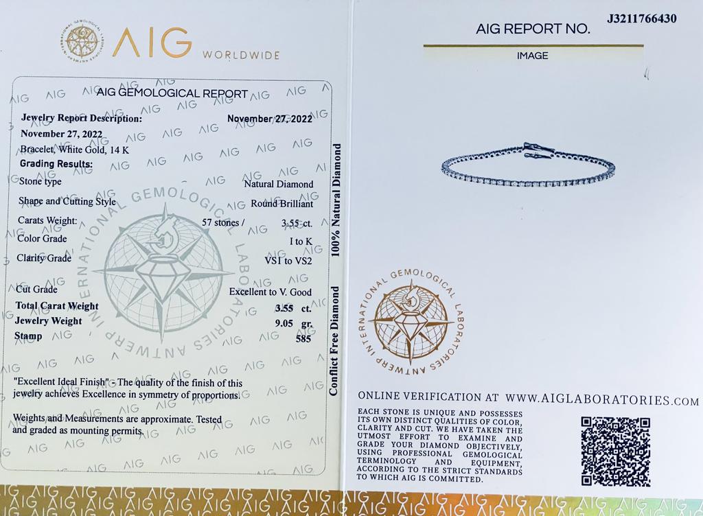 BRACCIALETTO IN ORO BIANCO 14K 9.05 GR CON DIAMANTI PER 3.55 CARATI COLORE I-K VS1-2 AIG 18CM CERTIFICATO AIG - BRC2100214k