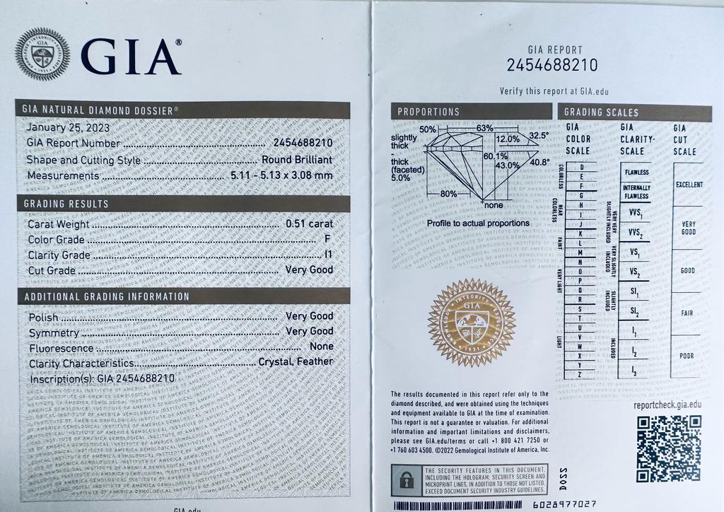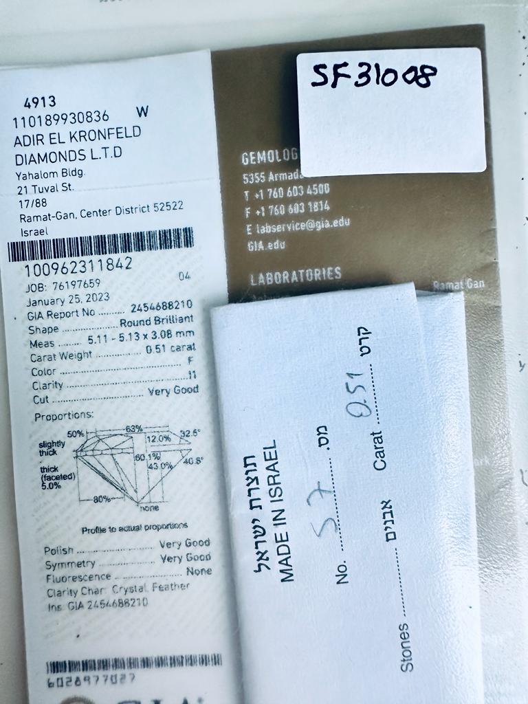 DIAMANTE NATURAL POLISHED 0,51 CARATI COLORE F - PUREZZA I1 - TAGLIO BRILLANTE - CERTIFICATO GIA - PUREZZA SF31008