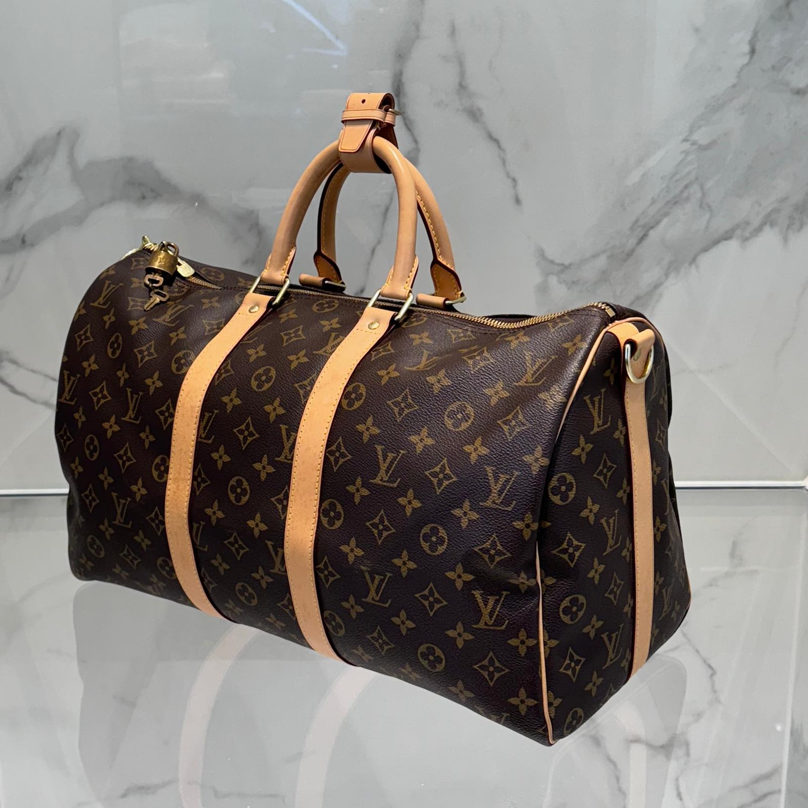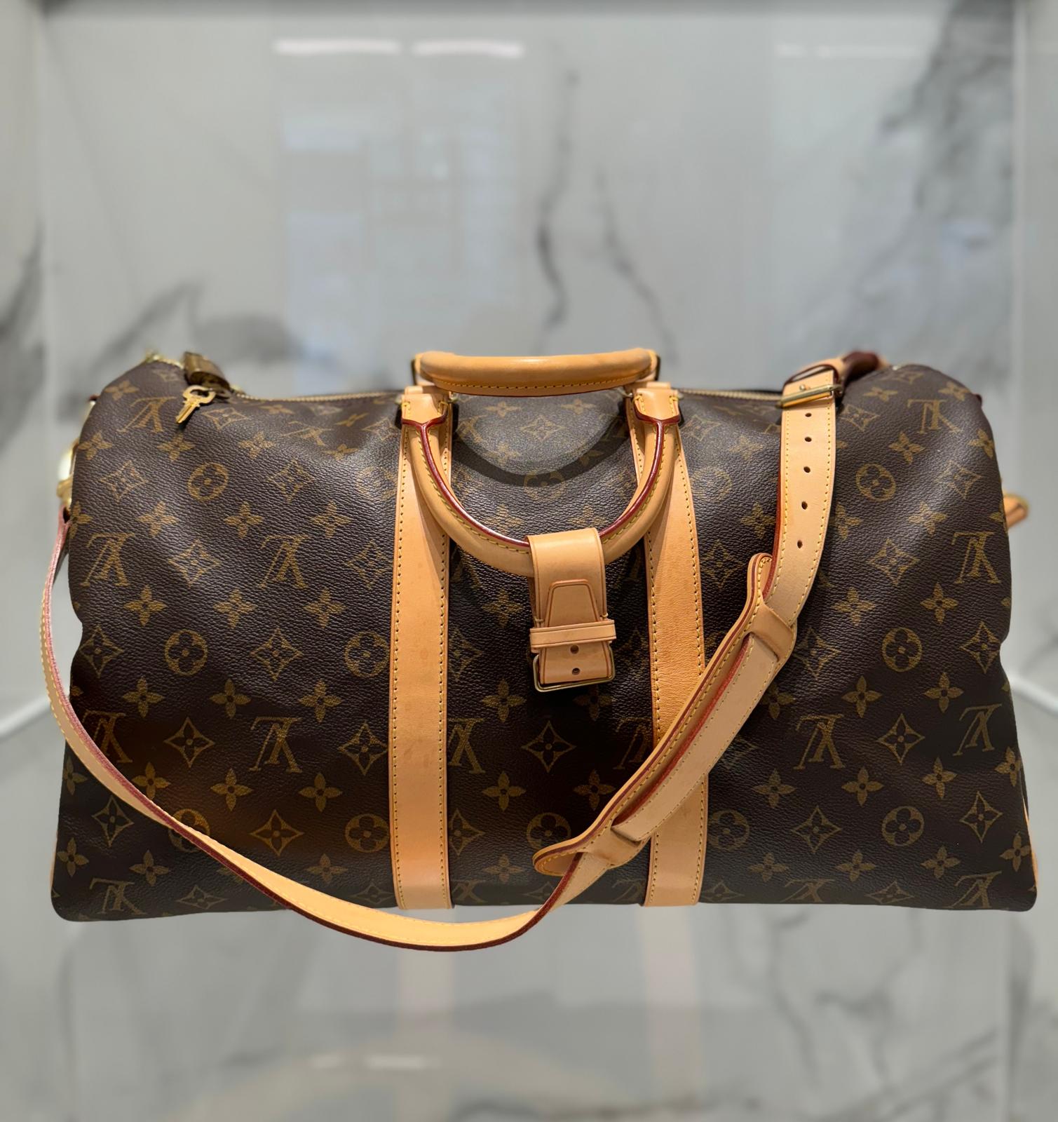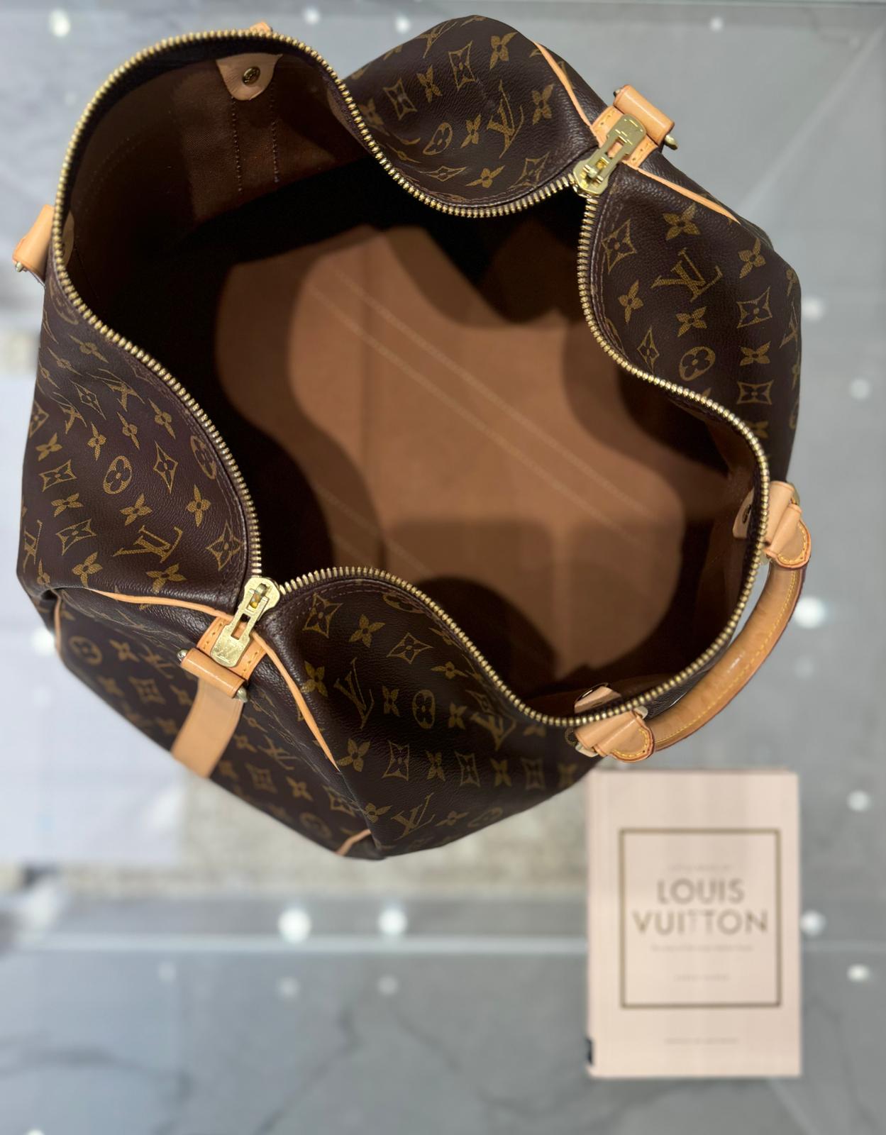 Louis Vuitton Keepall 45 monogram Tela monogram, dettagli vacchetta liscia, fodera interna in tessuto, parti metalliche dorate, tracolla. Ottime condizioni