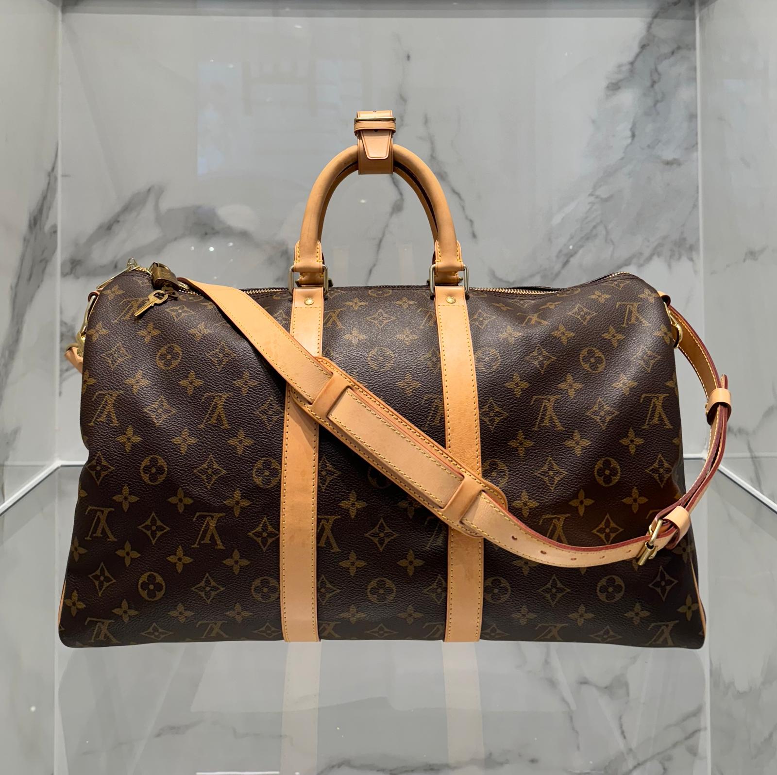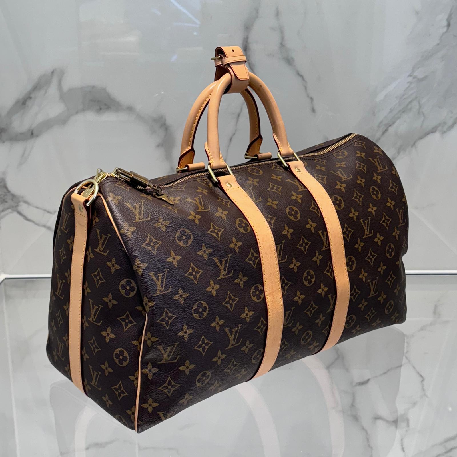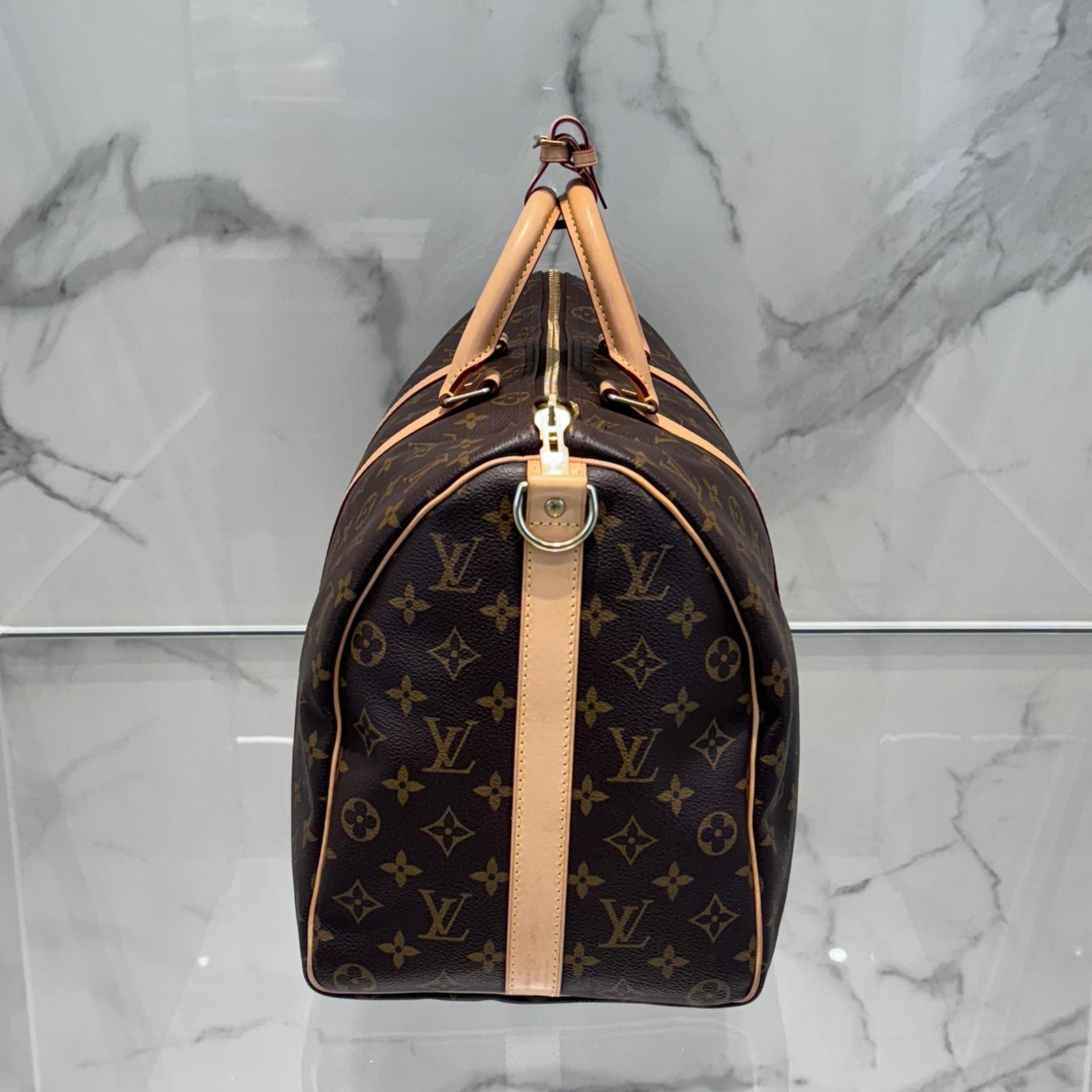 Louis Vuitton Keepall 45 monogram Tela monogram, dettagli vacchetta liscia, fodera interna in tessuto, parti metalliche dorate, tracolla. Ottime condizioni