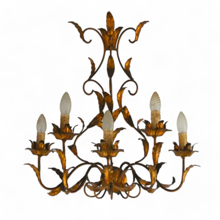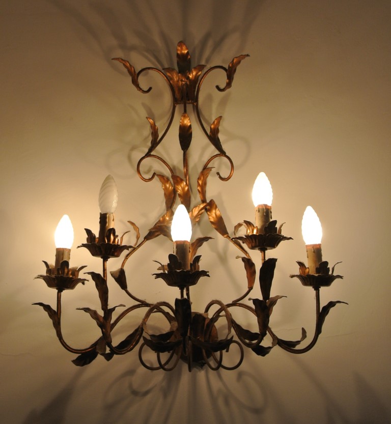 Grande applique a cinque fiamma in ferro battuto e dorato