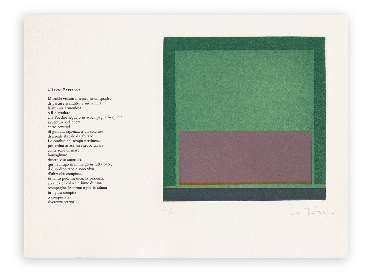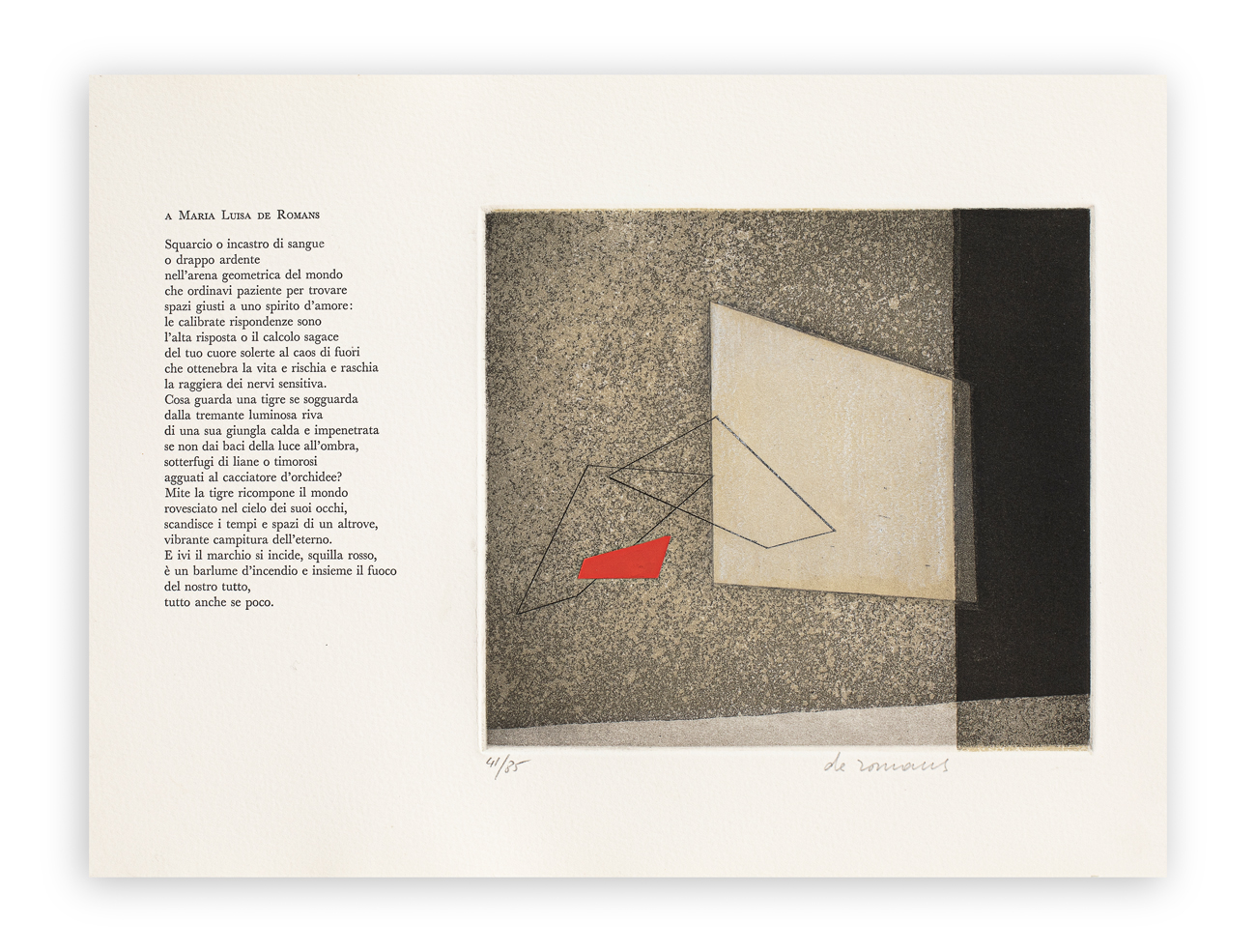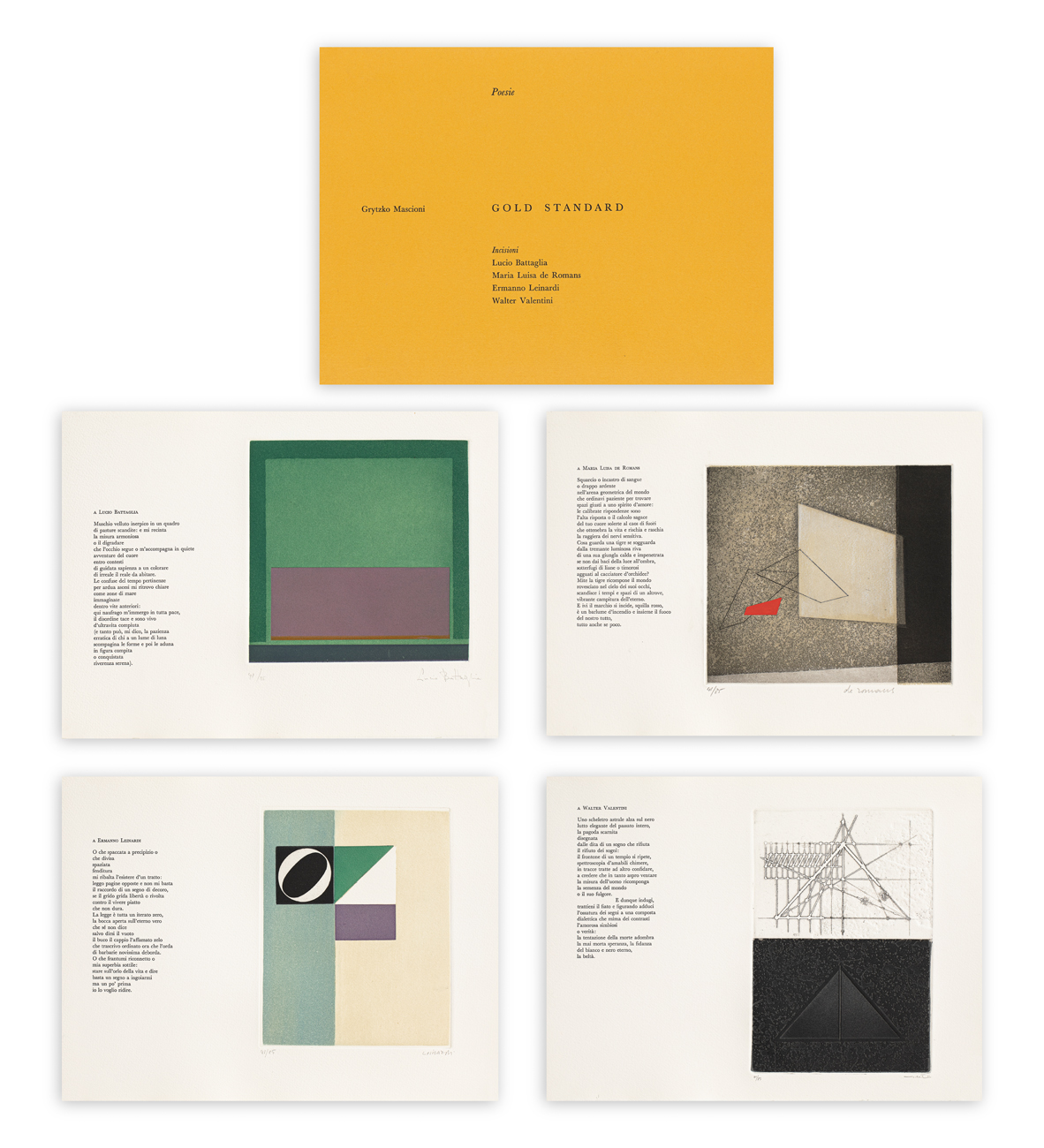 Elegante cartella contenente poesie di Grytzko Mascioni e 4 incisioni all'acquaforte e acquatinta di Lucio Battaglia, Maria Luisa De Romans, Ermanno Leinardi e Walter Valentini, ciascuna recante firma degli Artisti e numerazione (Esemplari 41/85) a matita al fronte