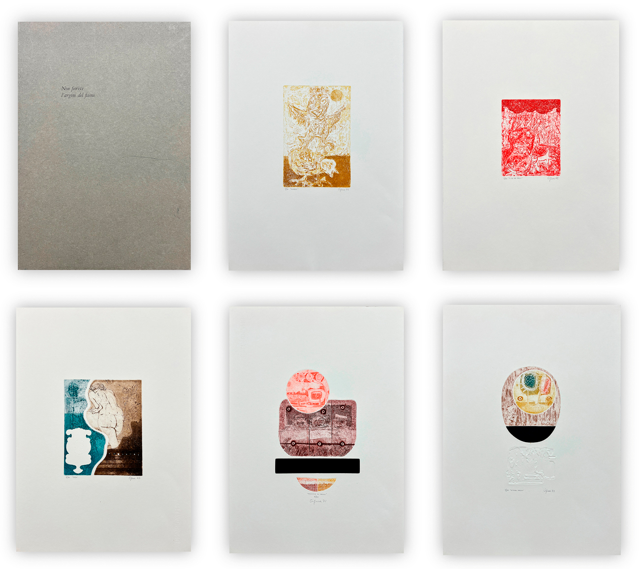 Cartella contenente 5 poesie di Paolo Levi e 5 acqueforti di Giorgio Cigna, ciascuna recante firma, titolo, datazione e numerazione (Esemplari 5/30) a matita al fronte