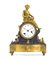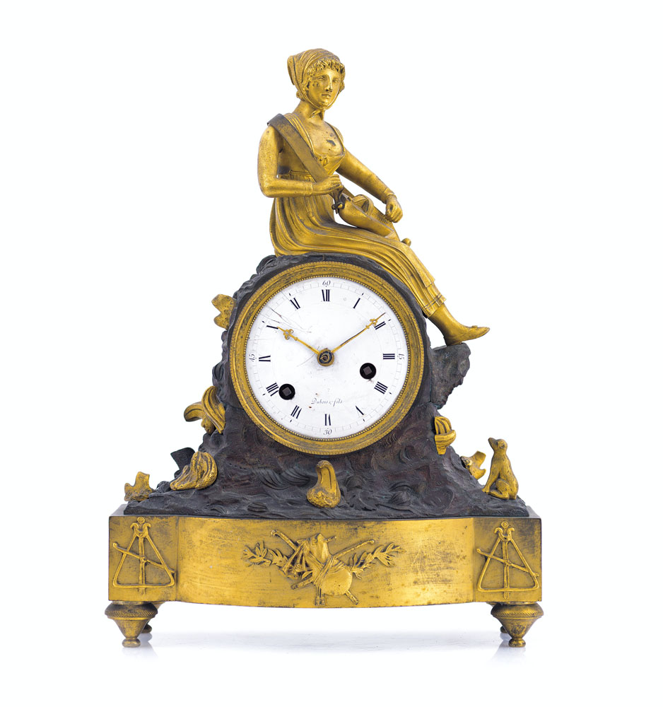 PENDOLA IN BRONZO PATINATO E DORATO, DUBOIS & FILS, INIZIO XIX SECOLO, cassa sagomata cimata da suonatrice di ghironda e cane su zolla, quadrante smaltato con numeri romani (fessure), suoneria delle ore e dei quarti, scappamento a verga; difetti, sbeccature, mancante di pendolo e da revisionare.