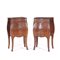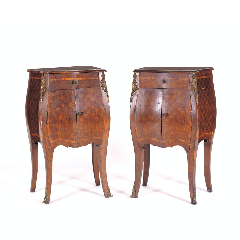 COPPIA DI MOBILETTI INTARSIATI A MARQUETERIE, XIX SECOLO, in stile settecentesco con fronte e fianchi mossi, decori geometrici entro riserve; usure, mancanze e sbeccature.