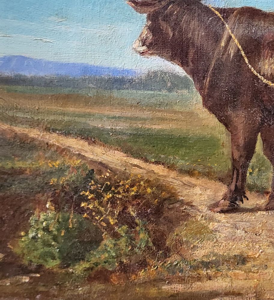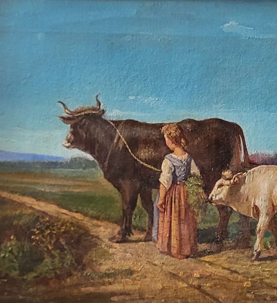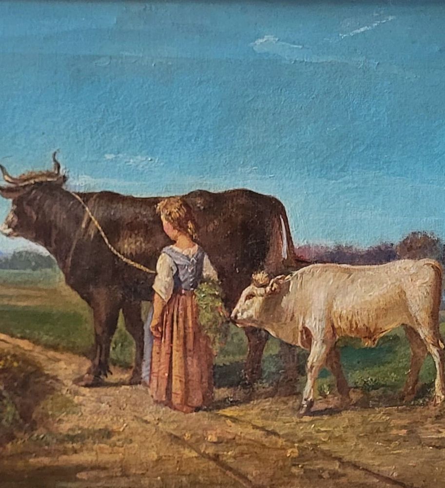 Dipinto olio su tela, periodo XIX secolo scuola Italiana, raffigurante Contadinella con buoi. Dimensioni compreso cornice: 49x36 cm. Dimensioni interno cornice: 40x27 cm. Da artista anonimo. Opera in buone condizioni e di eccellente qualità artistica.