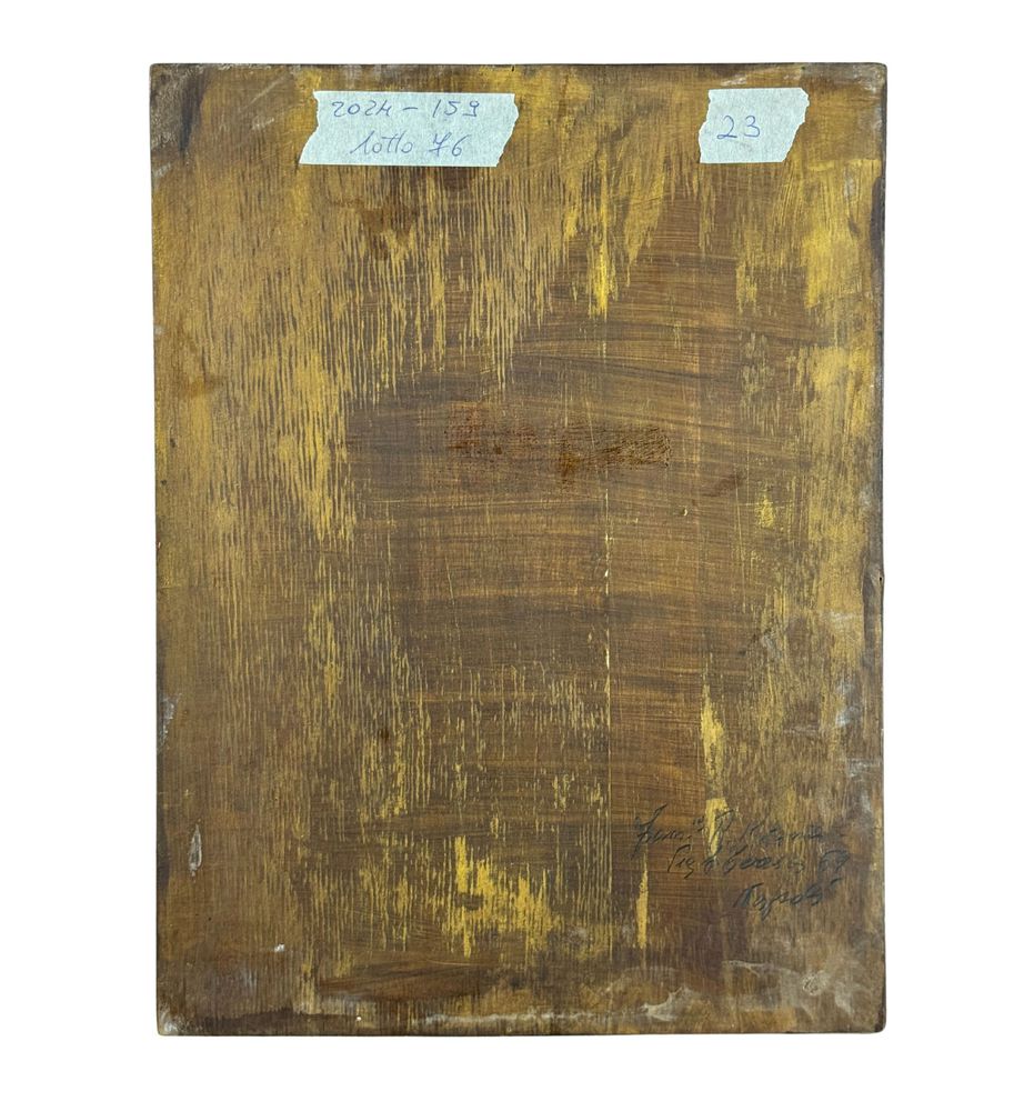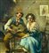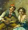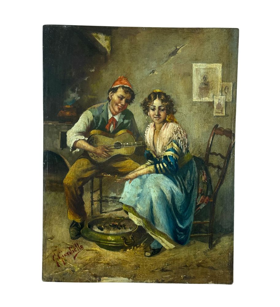 Dipinto olio su tavola, periodo XX secolo scuola Italiana, raffigurante Due personaggi in un interno. Dimensioni: 34x26 cm. Reca firma in basso a sinistra da G. Giardiello. Opera in buone condizioni.