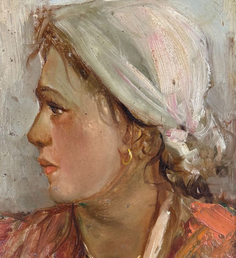 Dipinto olio su pannello, periodo XX secolo scuola Italiana, raffigurante Profilo di popolana. Dimensioni compreso cornice: 41x47 cm. Dimensioni interno cornice: 24x30 cm. Da artista anonimo. Opera in buone condizioni.