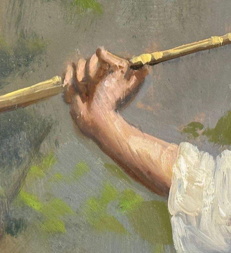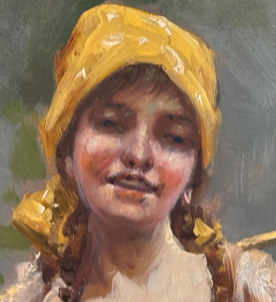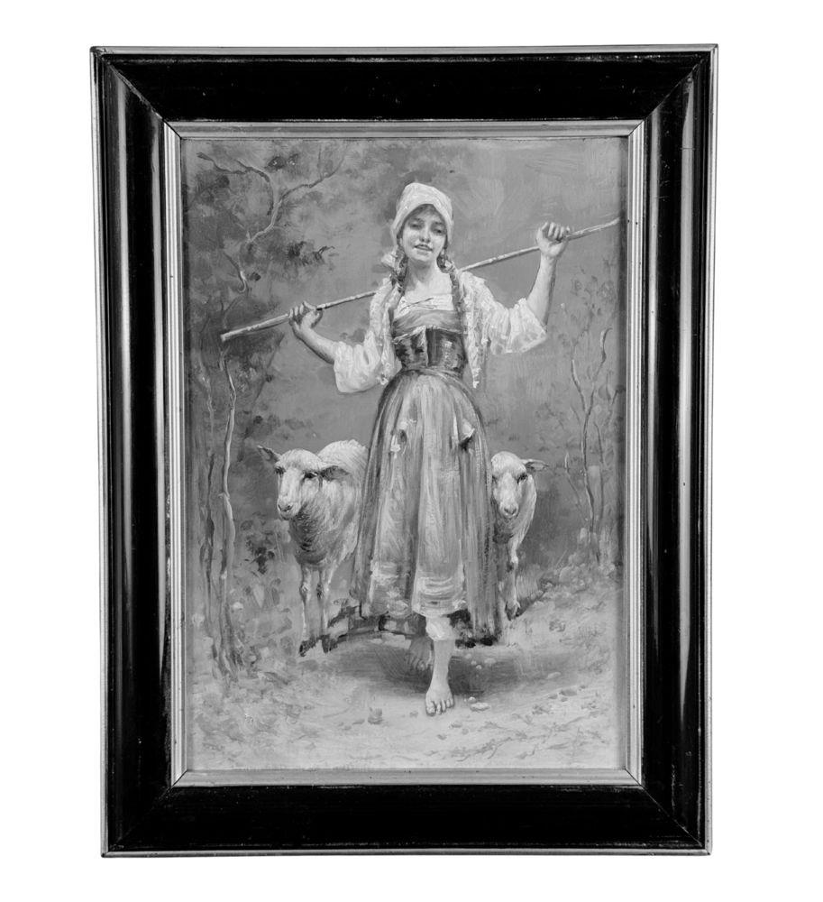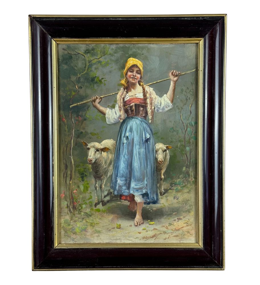 Dipinto olio su tavola, periodo XX secolo scuola Italiana, raffigurante Contadinella con gregge. Dimensioni compreso cornice: 36x47 cm. Dimensioni interno cornice: 27x38 cm. Da artista anonimo. Opera in buone condizioni.