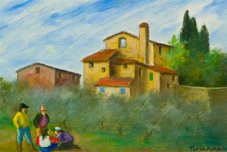 Nino Tirinnanzi (Greve in Chianti (Fi) 1923 - 2002) AMICI IN CAMPAGNA, 1996 Olio su cartone telato, cm. 20x30 Firmato in basso a destra. Sul verso: firma e titolo; Scritto: "Nino Tirinnanzi il Racconto della pittura 2", edizioni Masso delle Fate.