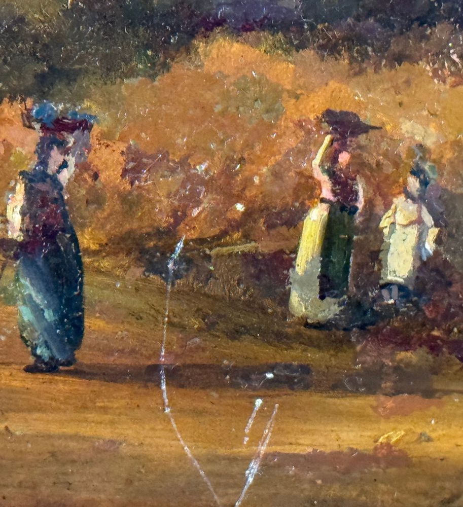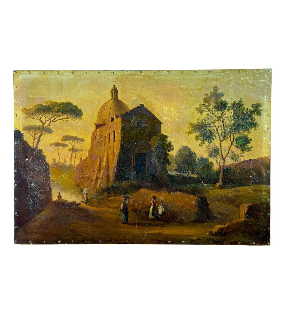 Olio su lastra da metallo, periodo XIX/XX secolo scuola Italiana, raffigurante Paesaggio con chiesetta e personaggi. Dimensioni: 54x37 cm. Da artista anonimo. Opera in buone condizioni con lievi segni di vissuto come da foto allegate.