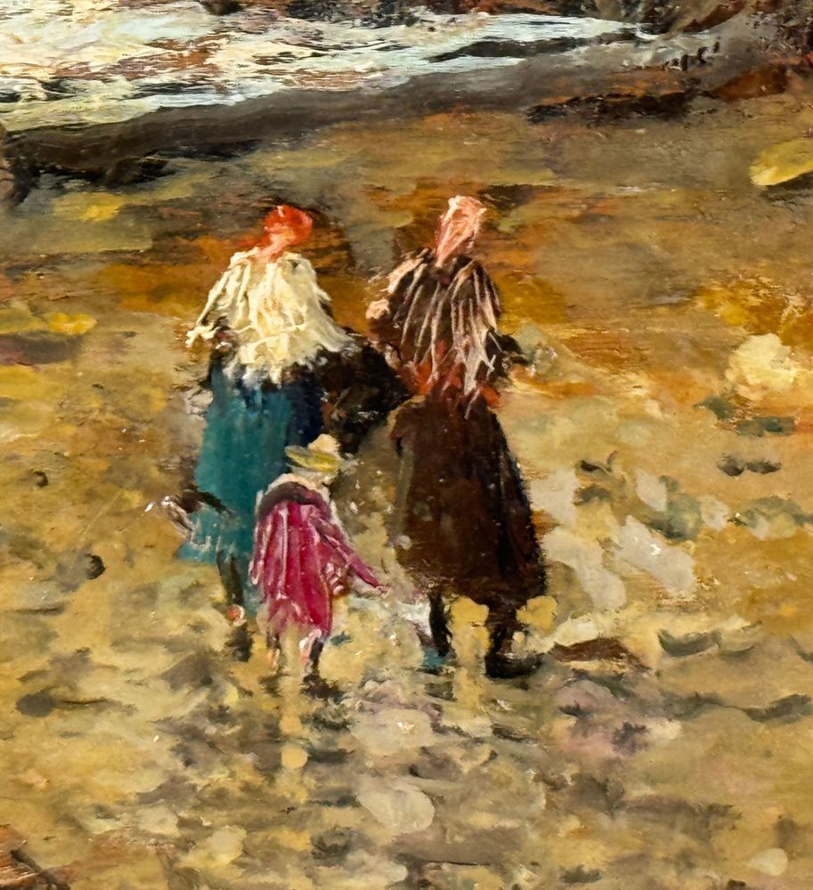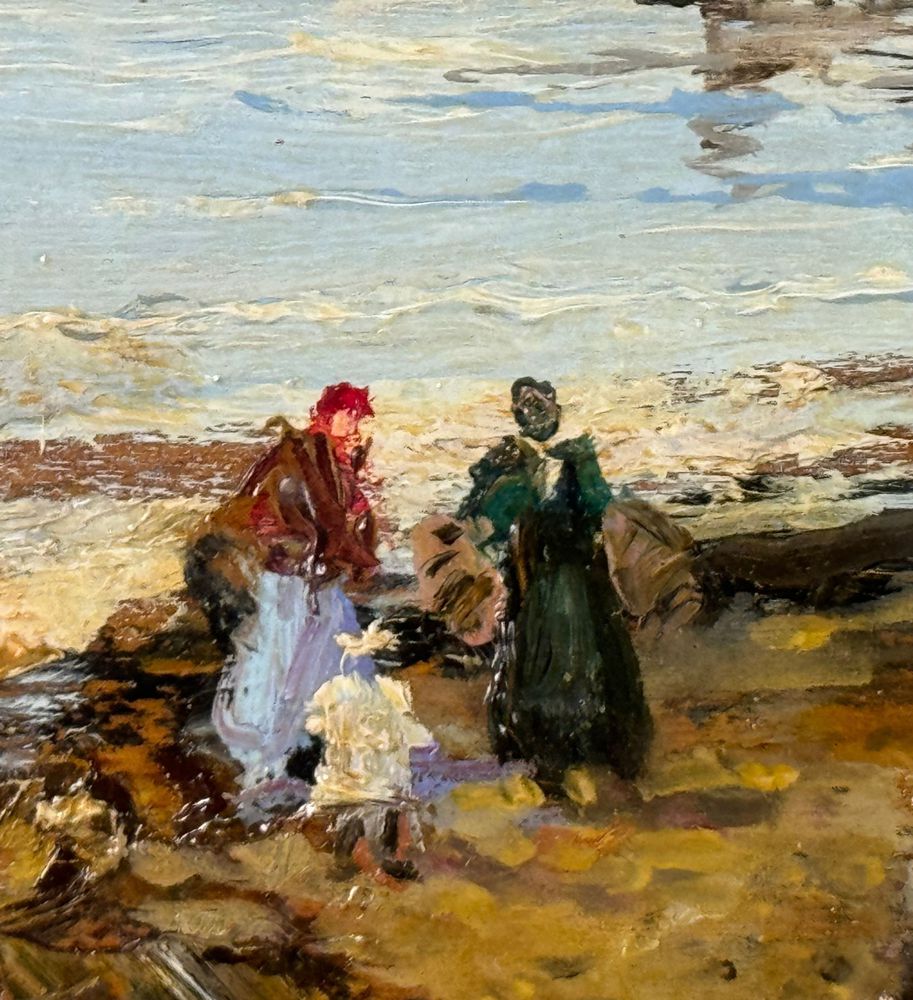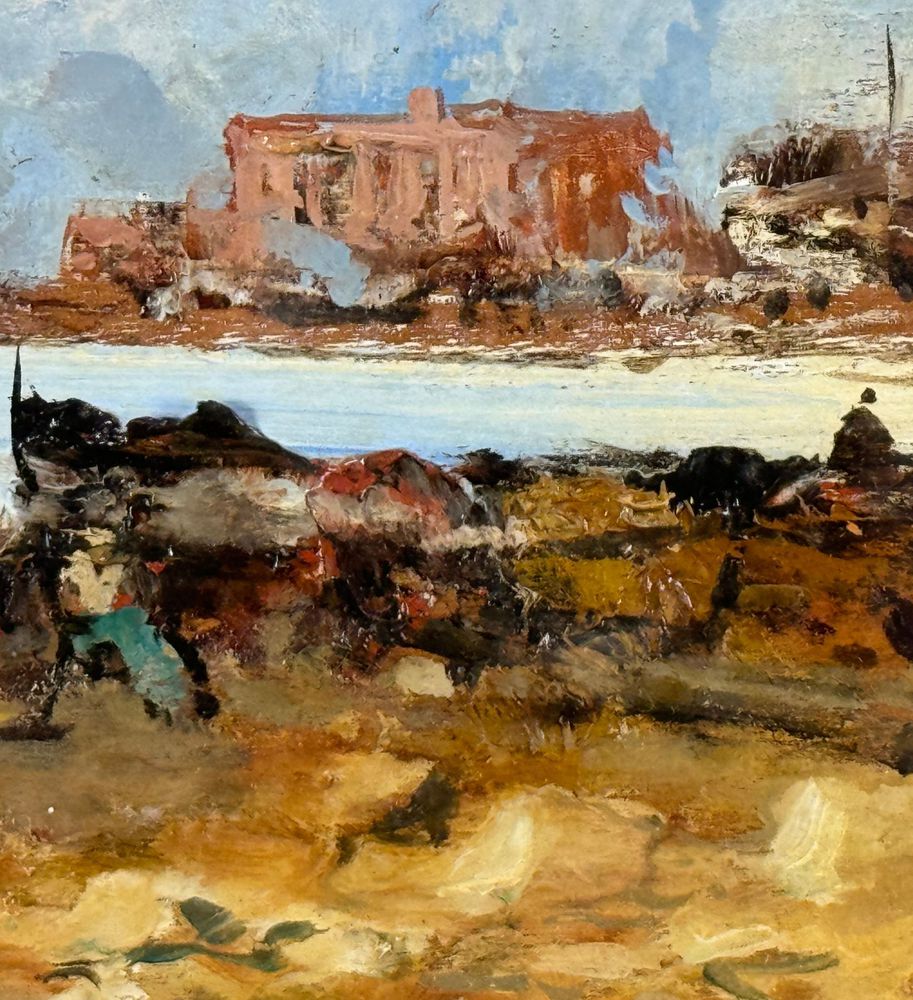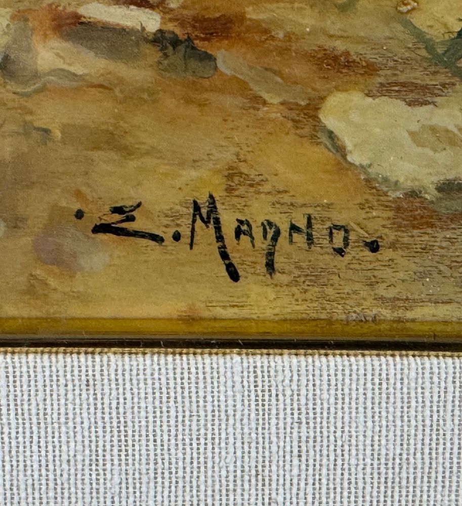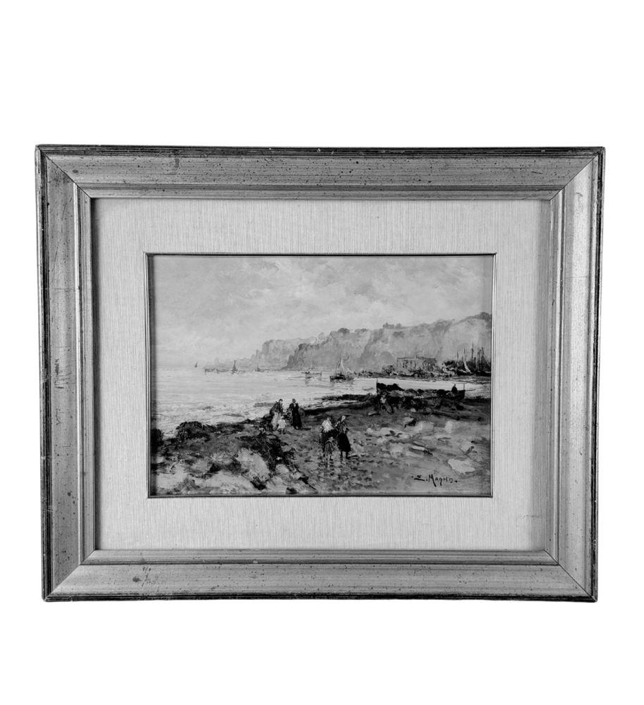 Dipinto olio su tavola, periodo XX secolo scuola Italiana, raffigurante Scorcio di marina con personaggi. Dimensioni compreso cornice: 53x43 cm. Dimensioni interno cornice: 35x25 cm. Reca firma in basso a destra da Eugenio Magno. Opera in buone condizioni.
