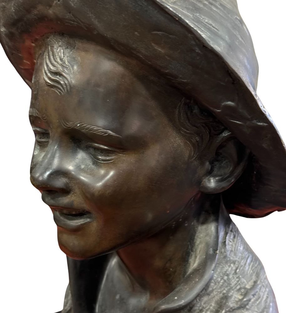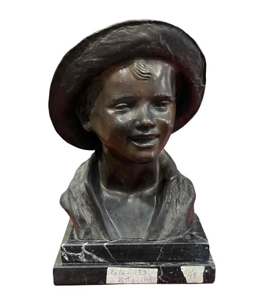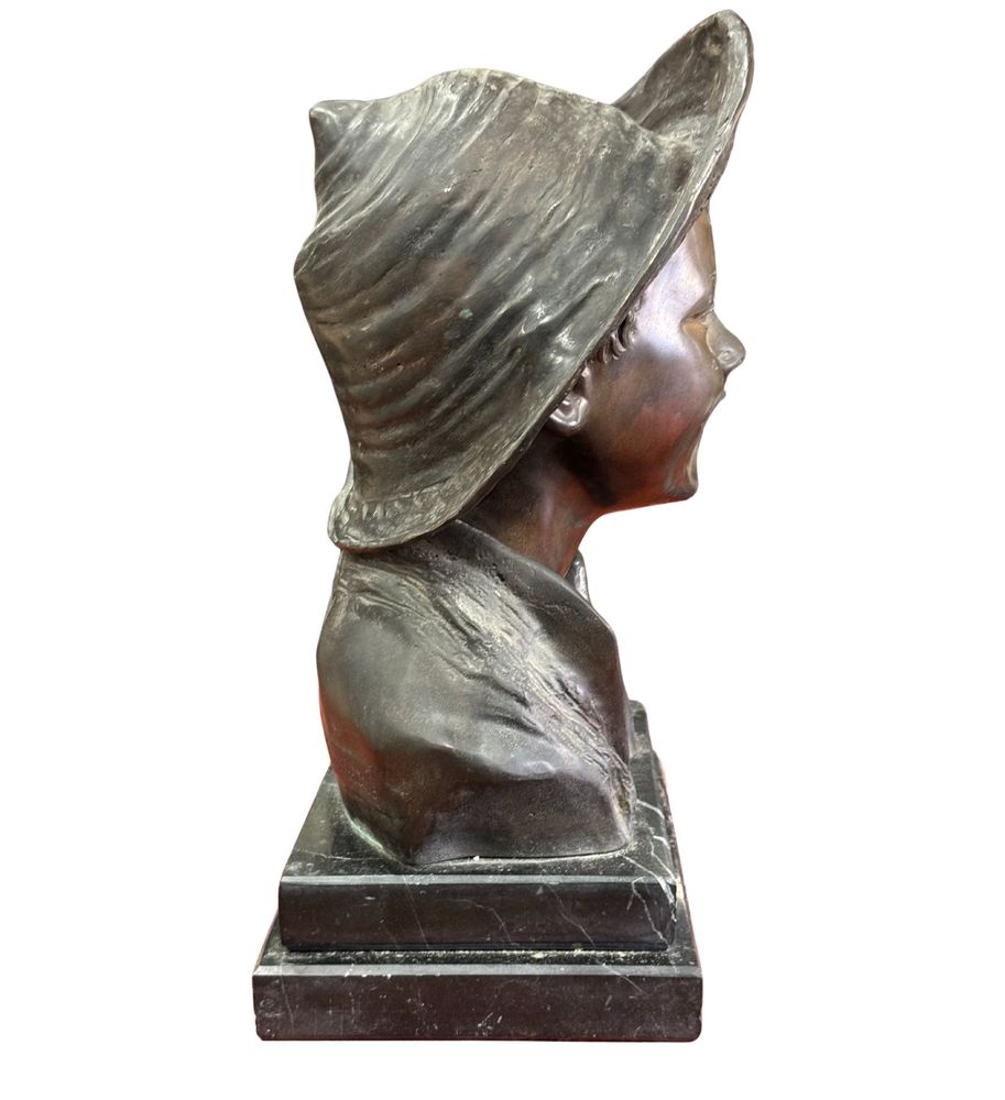 Scultura in bronzo a cera persa, periodo XX secolo raffigurante Bambino con cappello. Dimensioni: 38x24x17 cm. Reca firma sul retro da De Martino. Scultura in buone condizioni.