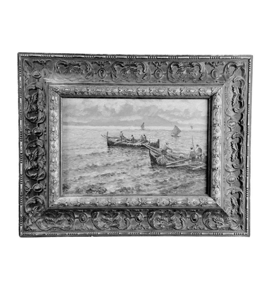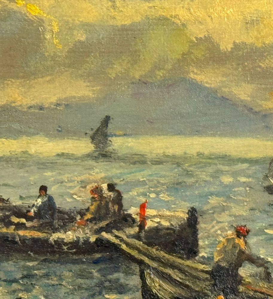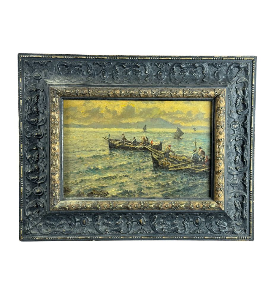 Dipinto olio su tavola, periodo XX secolo scuola Napoletana, raffigurante Marina partenopea. Dimensioni compreso cornice: 47x37 cm. Dimensioni interno cornice: 30x20 cm. Da artista anonimo. Opera in ottime condizioni.