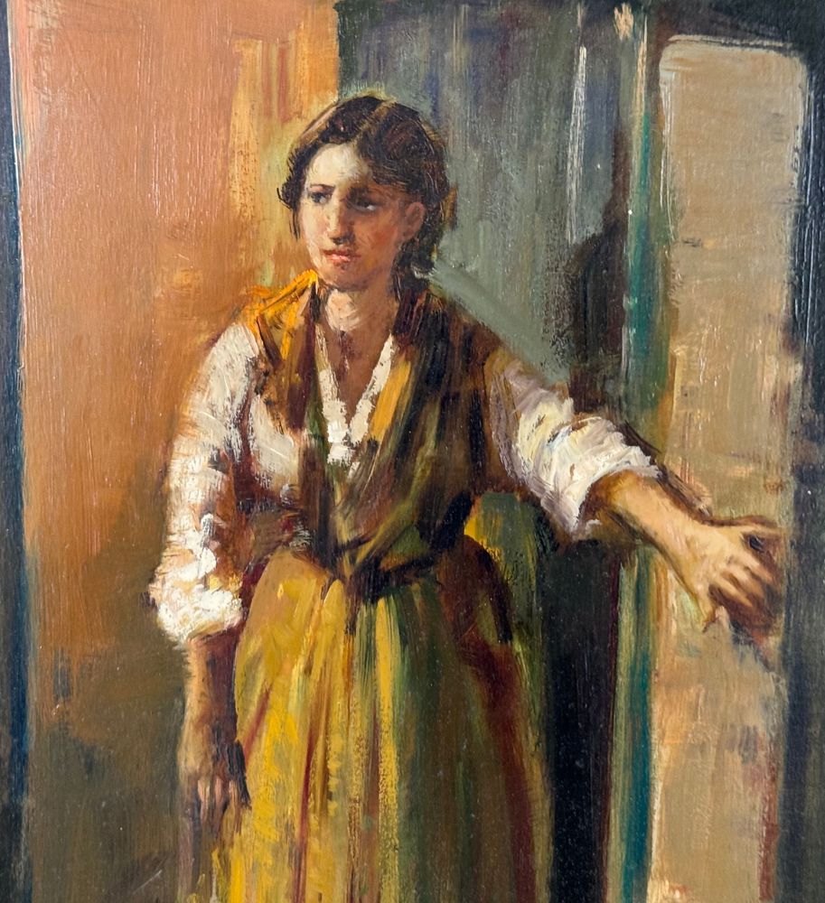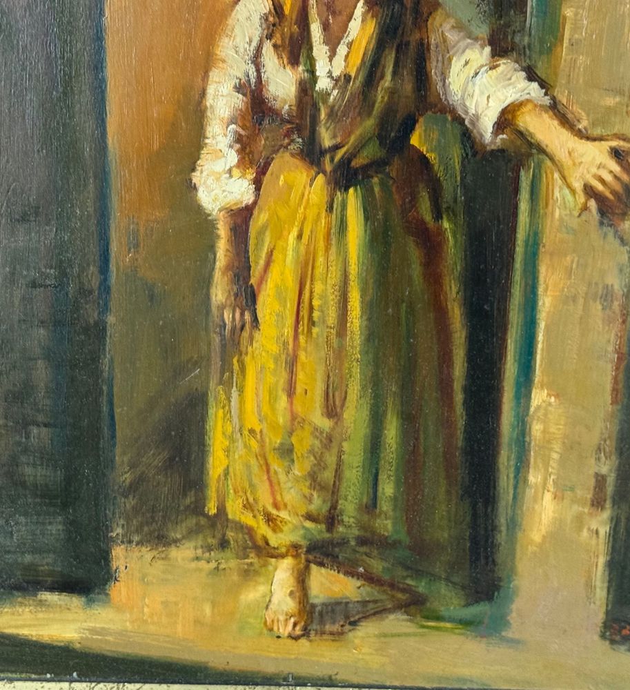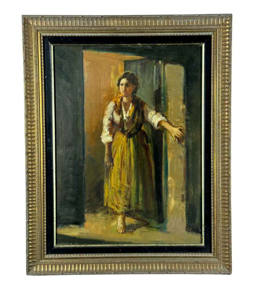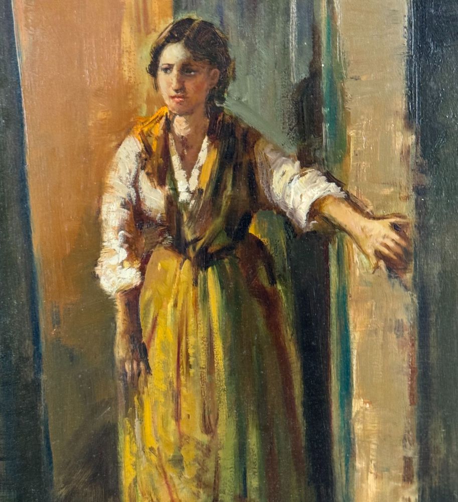 Dipinto olio su tavola, periodo XX secolo scuola Napoletana, raffigurante Donna alla porta. Dimensioni compreso cornice: 41x51 cm. Dimensioni interno cornice: 30x40 cm. Da artista anonimo. Opera in ottime condizioni.