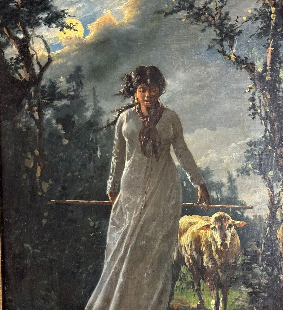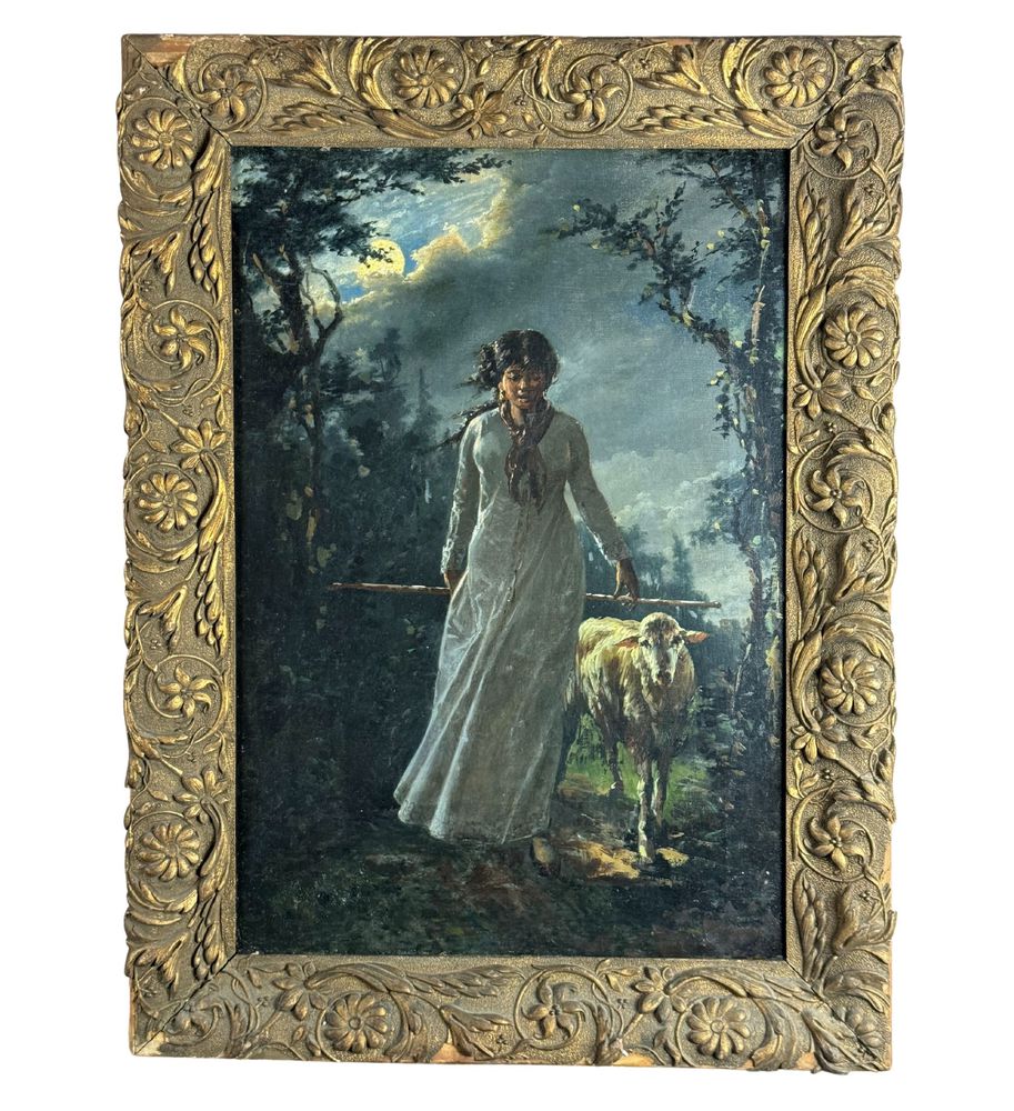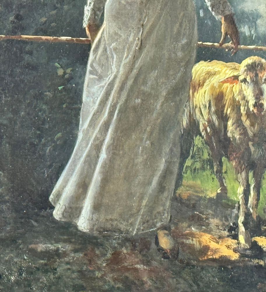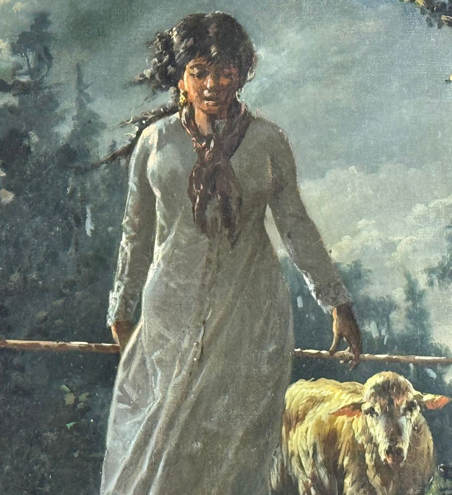 Dipinto olio su tela, periodo XIX/XX secolo scuola Napoletana, raffigurante Donna con gregge. Dimensioni compreso cornice: 48x64 cm. Dimensioni interno cornice: 36,5x51,5 cm. Da artista anonimo. Opera in ottime condizioni.