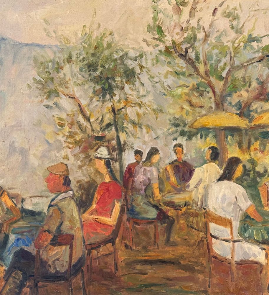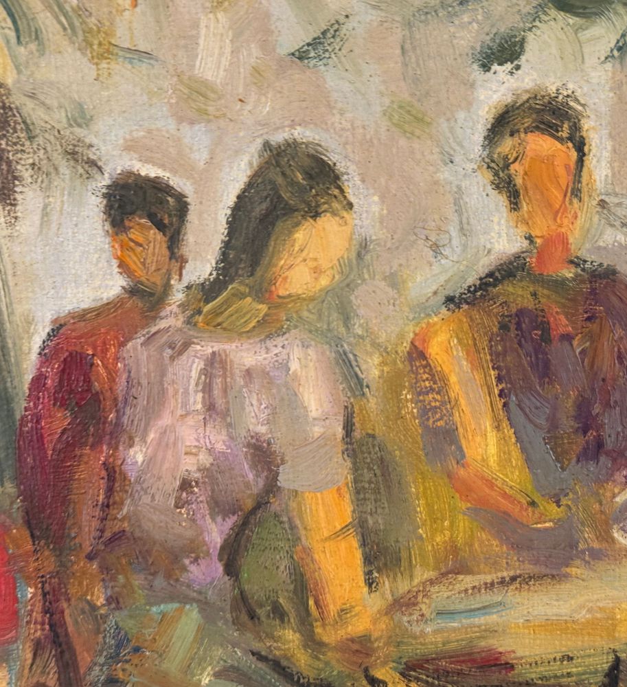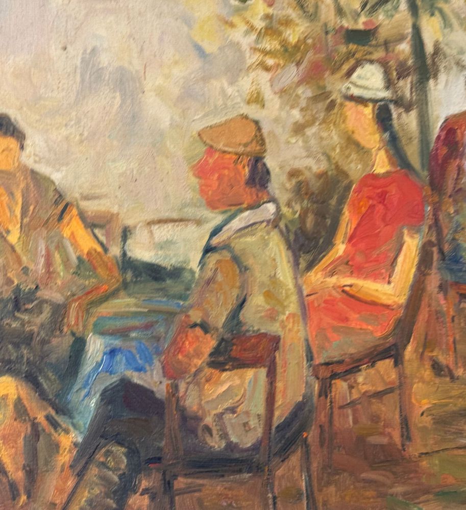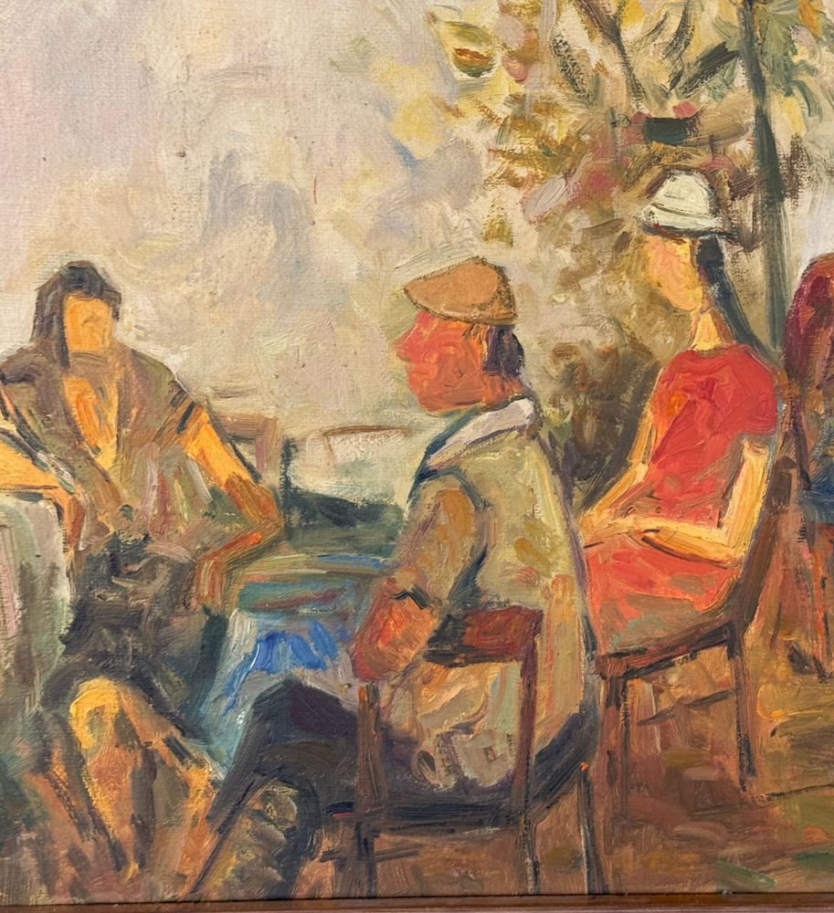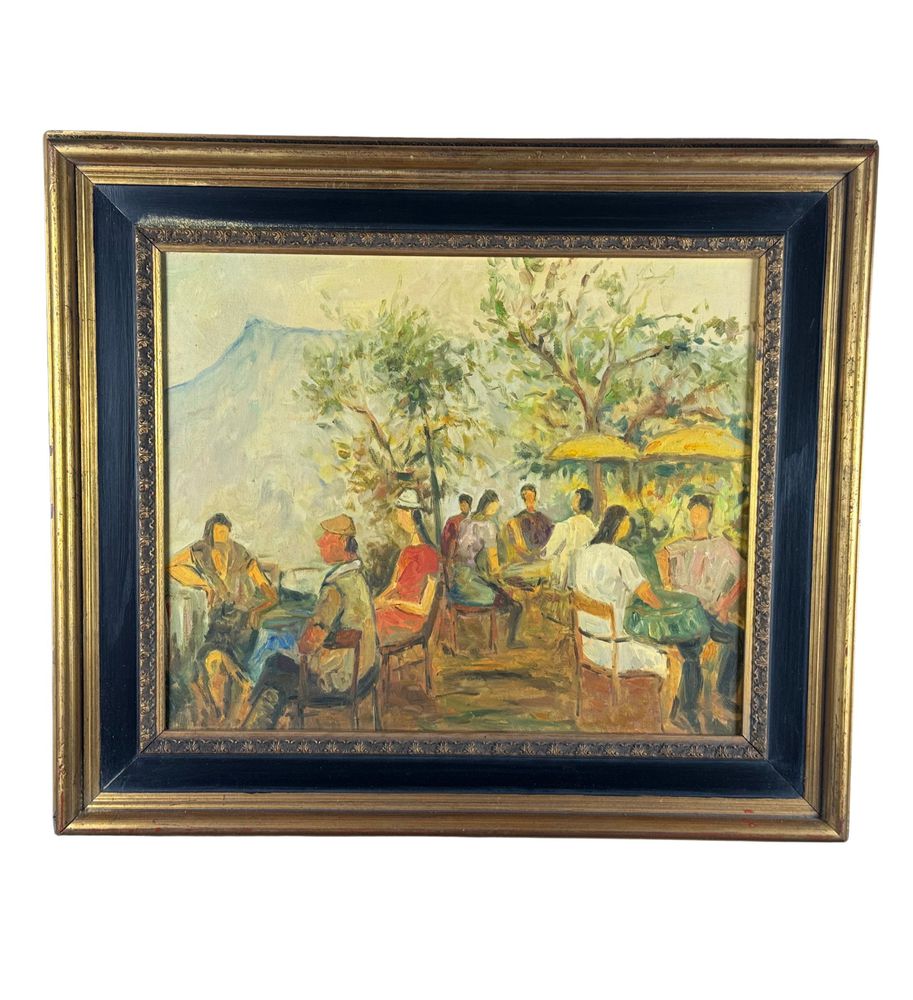 Dipinto olio su tela, periodo XX secolo scuola Napoletana, raffigurante Personaggi in giardino. Dimensioni compreso cornice: 75x65 cm. Dimensioni interno cornice: 55x45 cm. Da artista anonimo. Opera in buone condizioni.