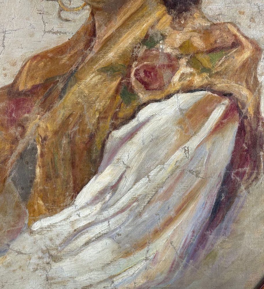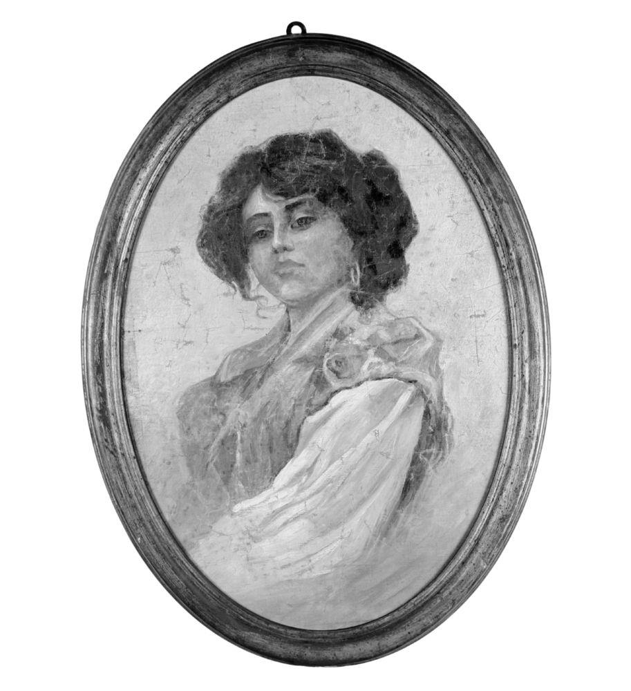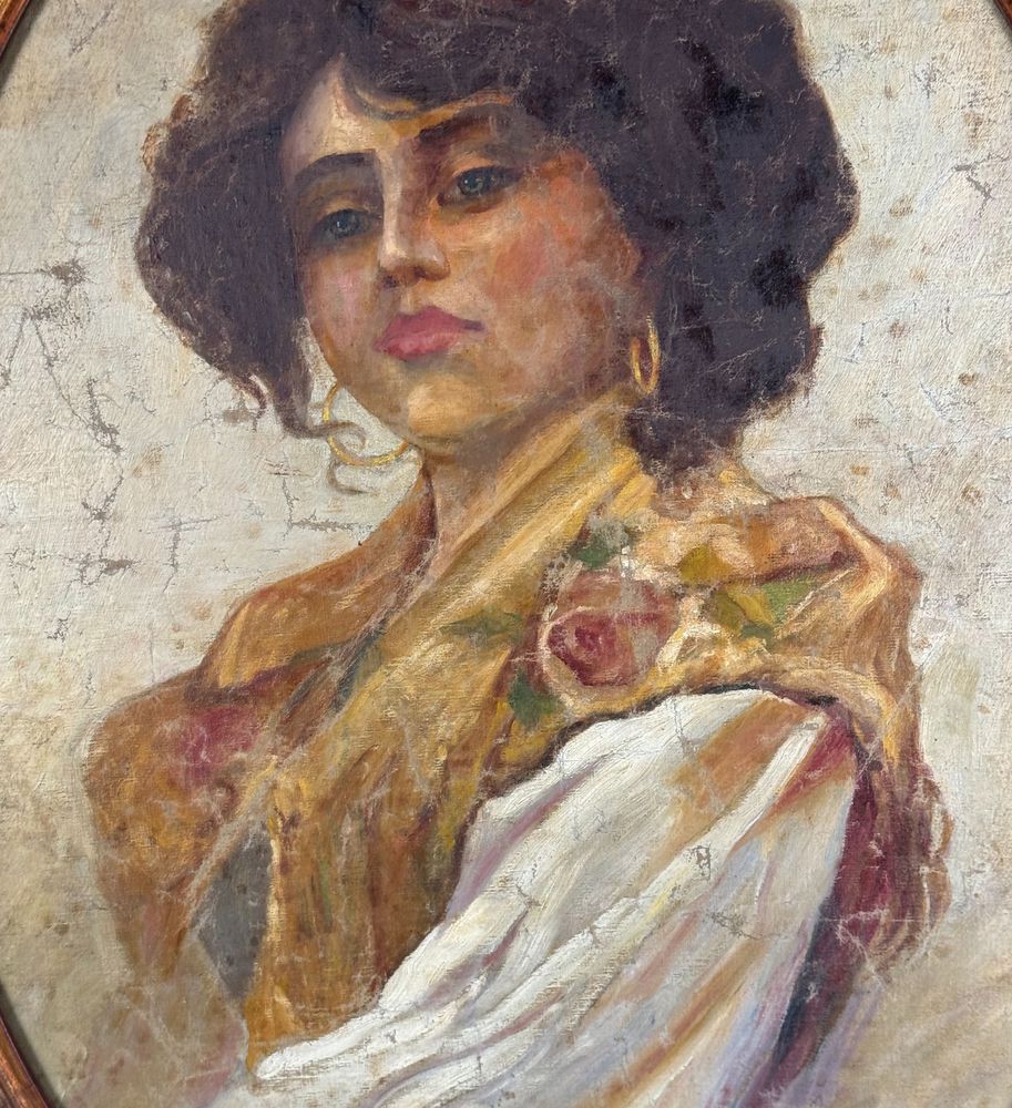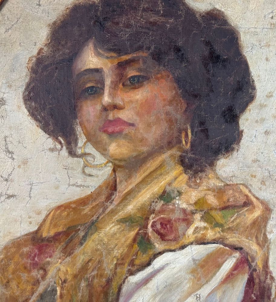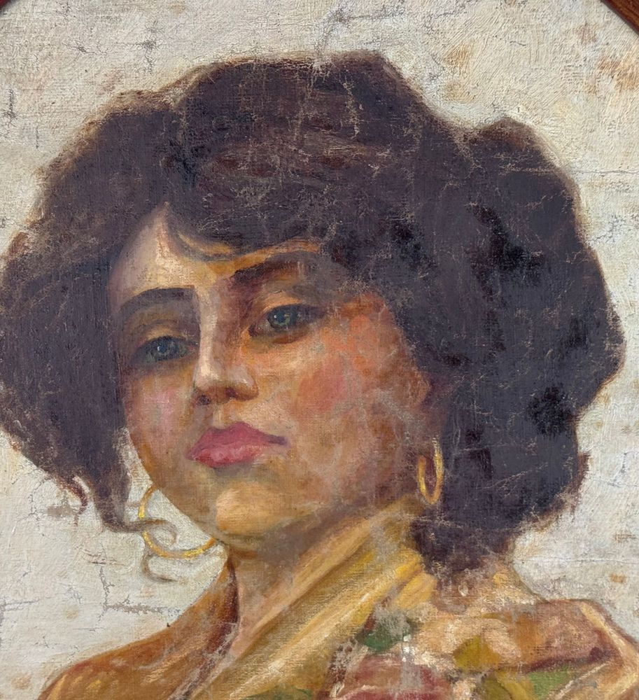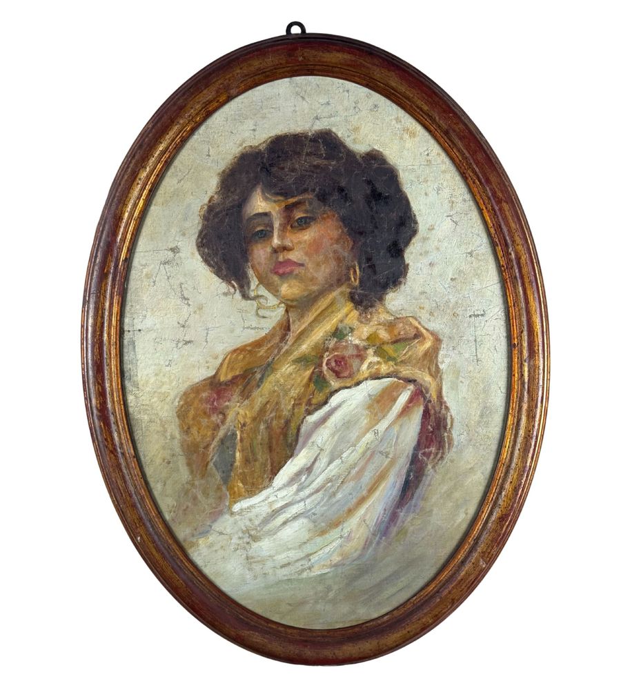 Dipinto olio su tela applicata su cartoncino, periodo XIX/XX secolo scuola Napoletana, raffigurante Ritratto di donna. Dimensioni compreso cornice: 78x58 cm. Dimensioni interno cornice: 50x70 cm. Da artista anonimo. Opera in buone condizioni.