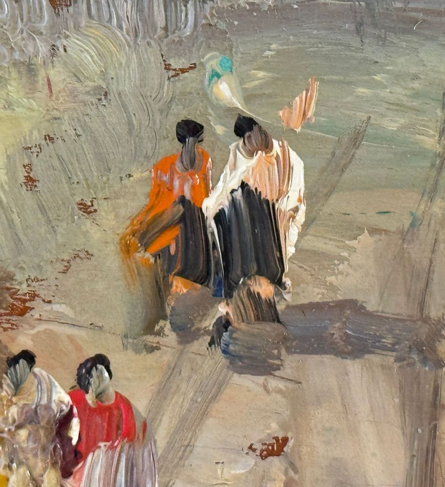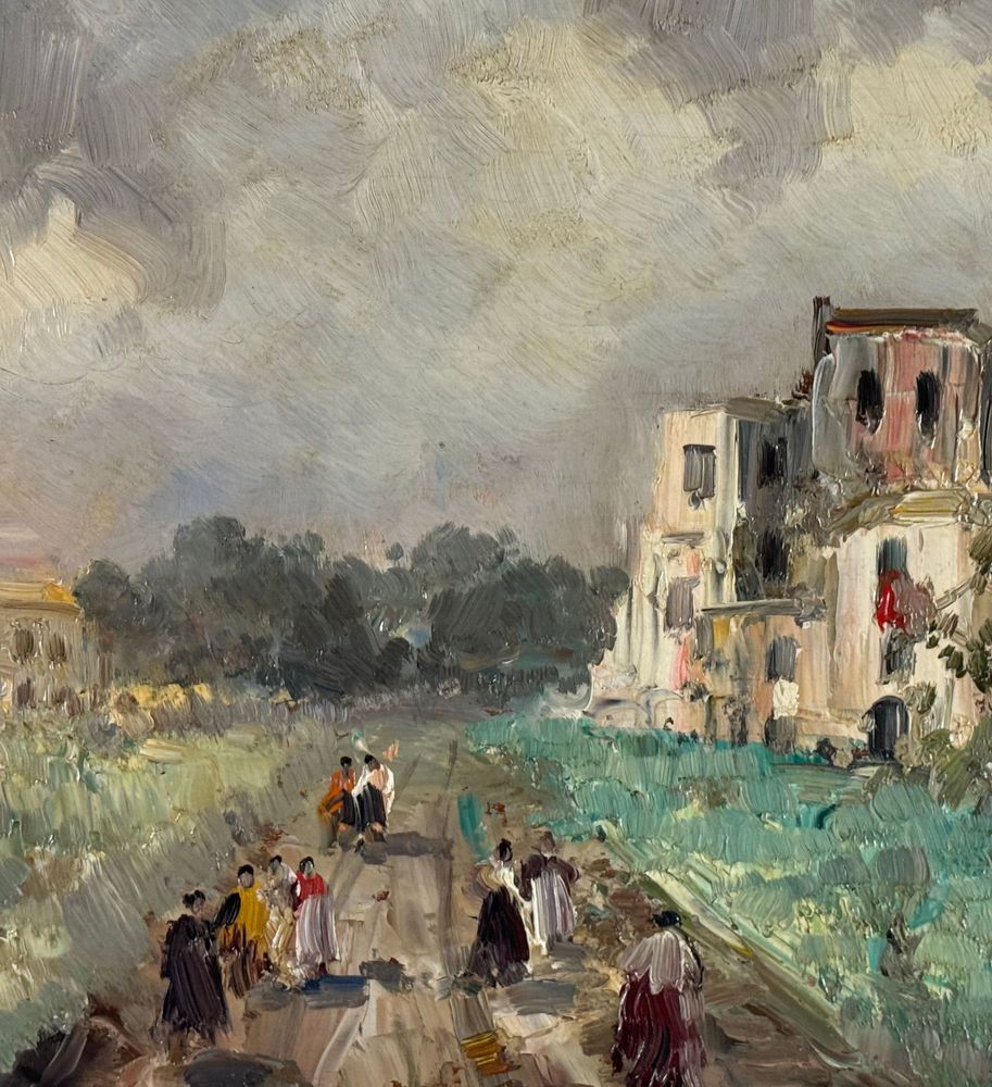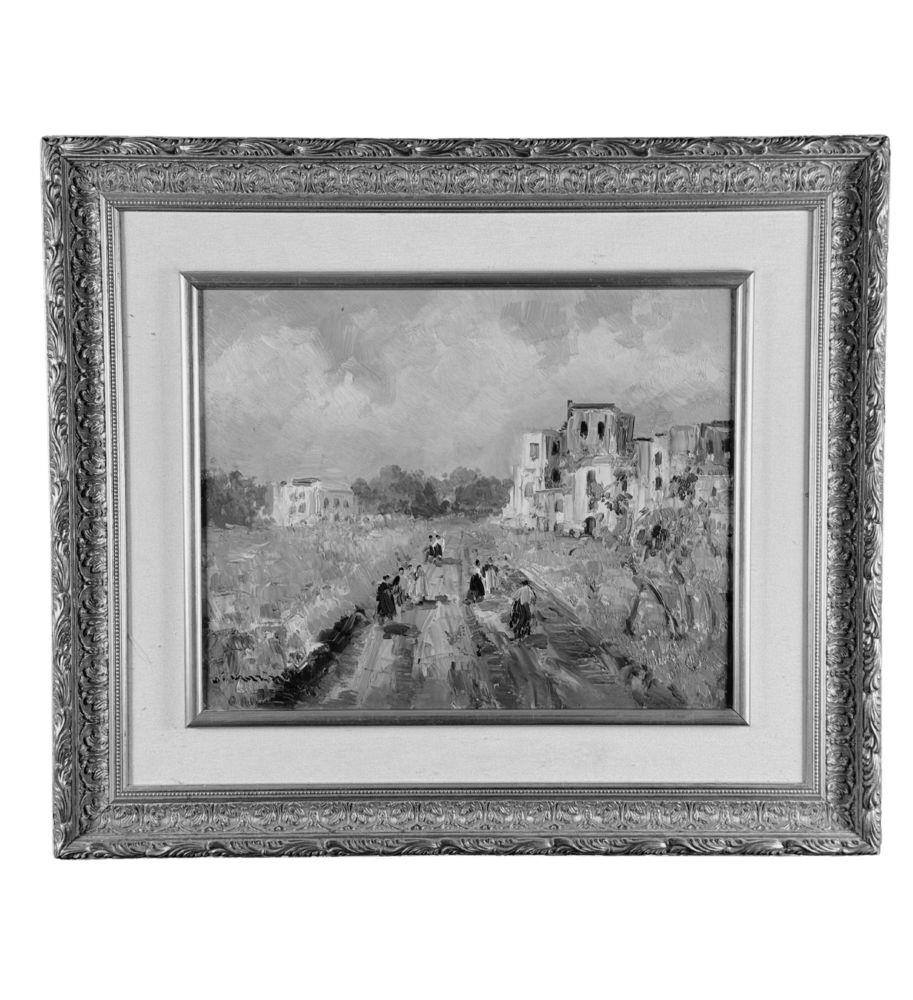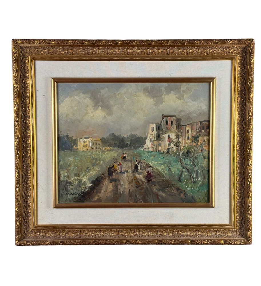 Dipinto olio su pannello, periodo XX secolo scuola Italiana, raffigurante Paesaggio con personaggi. Dimensioni compreso cornice: 75x65 cm. Dimensioni interno cornice: 50x40 cm. Reca firma in basso a sinistra da Francesco Di Marino. Opera in buone condizioni.