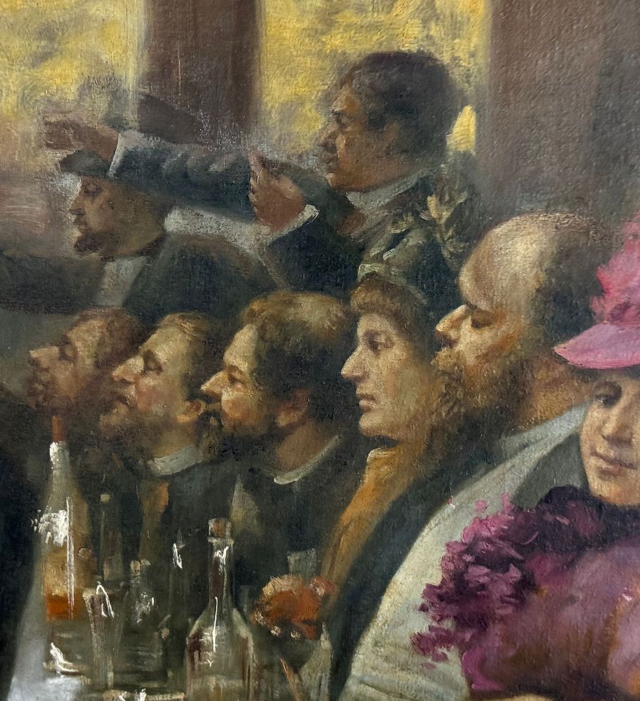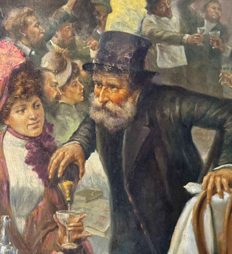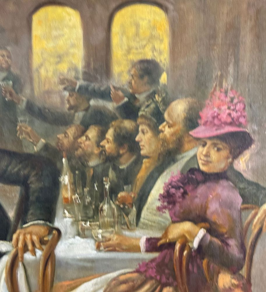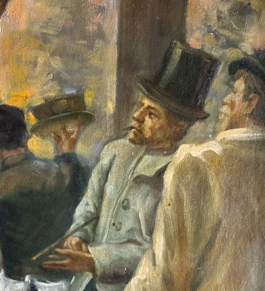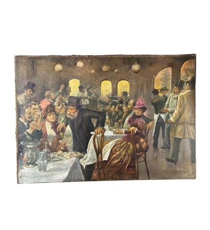 Dipinto olio su tela, periodo XX secolo scuola Francese, raffigurante Personaggi alla locanda. Dimensioni: 70x100 cm. Da artista anonimo. Opera in buone condizioni. Da segnalare un vecchio rintelo.