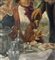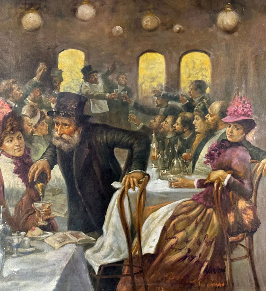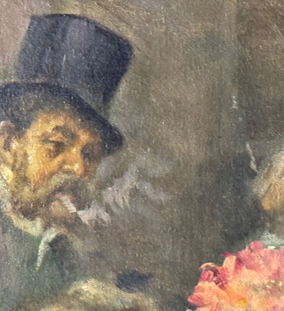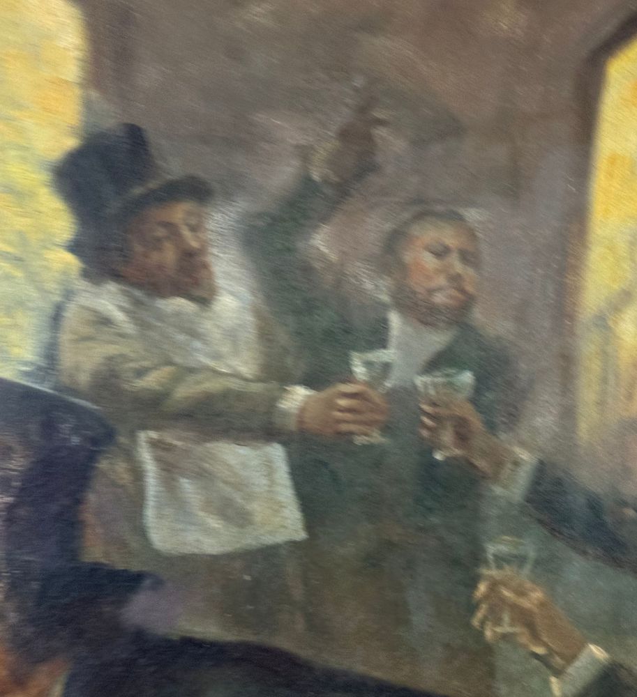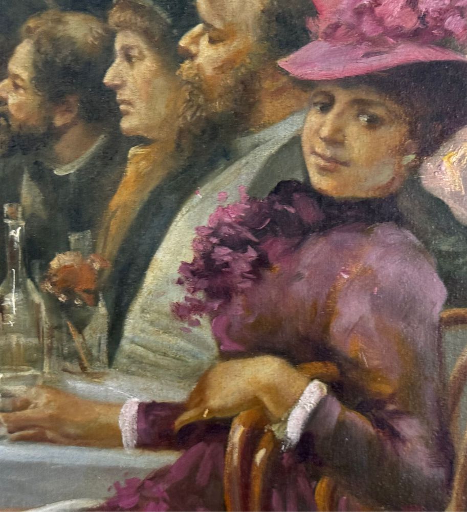 Dipinto olio su tela, periodo XX secolo scuola Francese, raffigurante Personaggi alla locanda. Dimensioni: 70x100 cm. Da artista anonimo. Opera in buone condizioni. Da segnalare un vecchio rintelo.