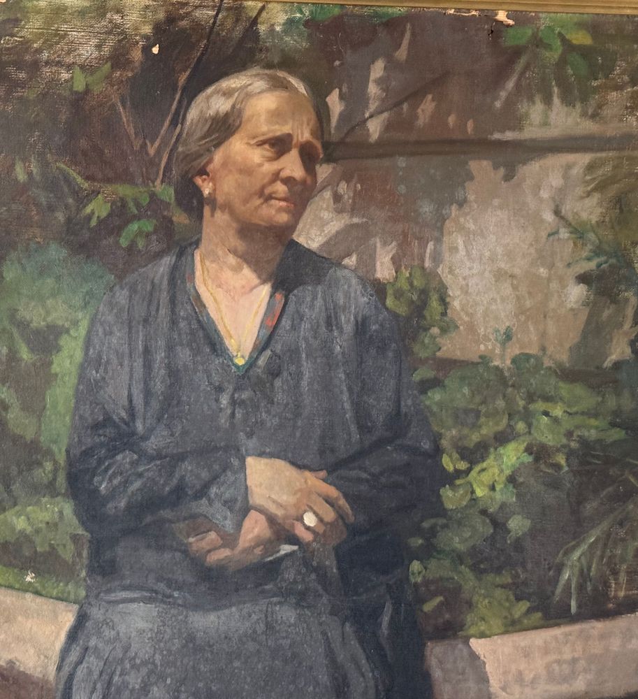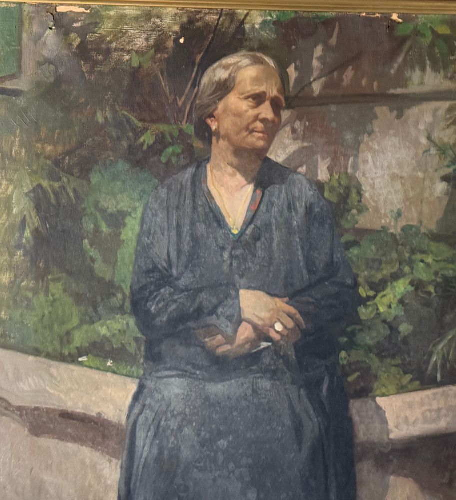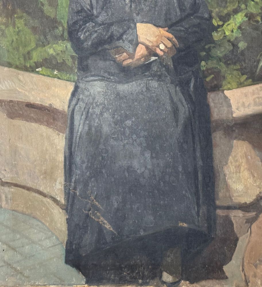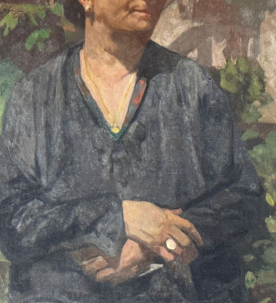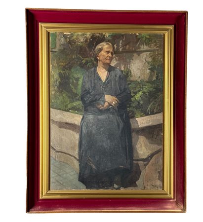 Dipinto olio su tela, periodo XX secolo scuola Italiana, raffigurante Ritratto di donna in giardino. Dimensioni compreso cornice: 72x91 cm. Dimensioni interno cornice: 51x72 cm. Reca firma in basso a destra da artista non identificato. Opera in discrete condizioni.