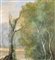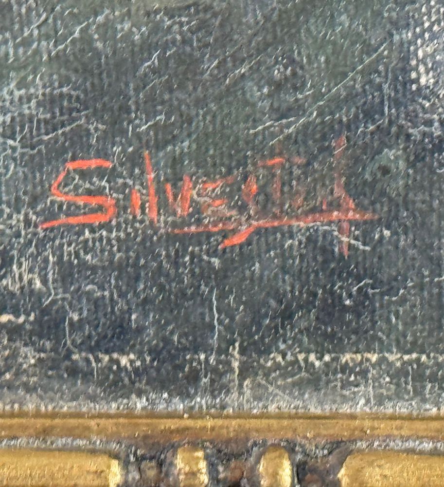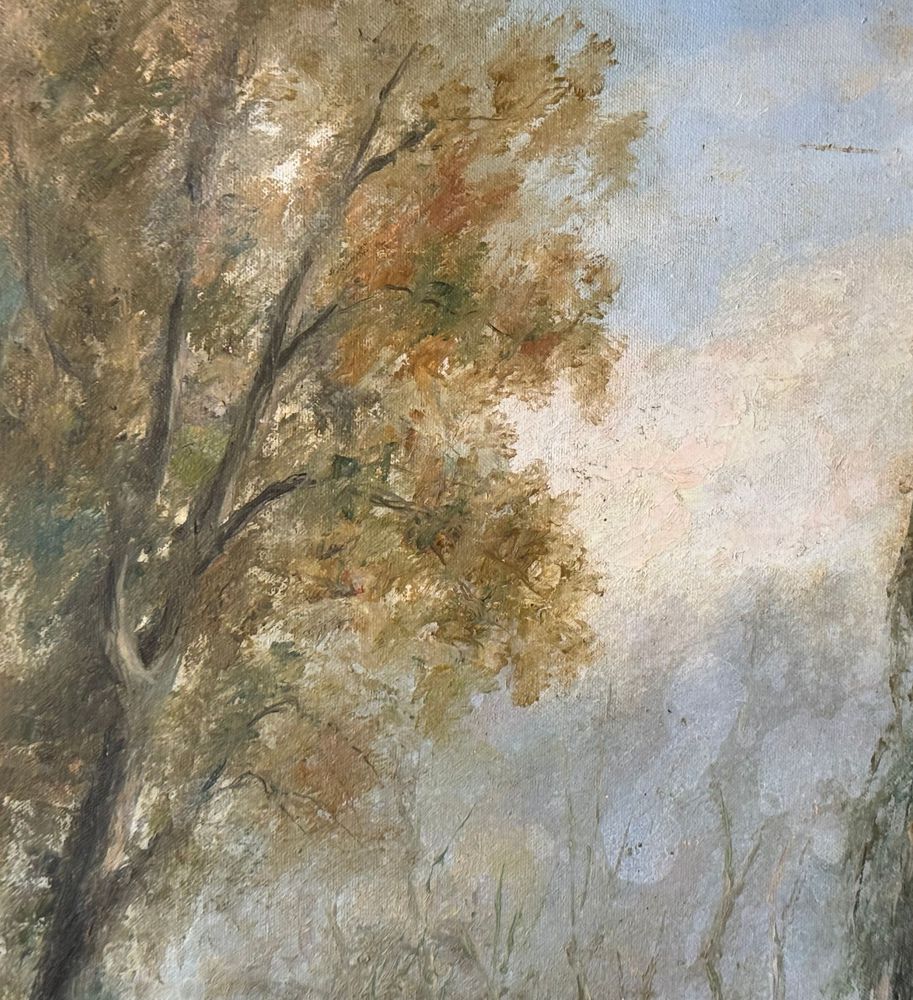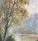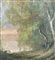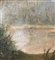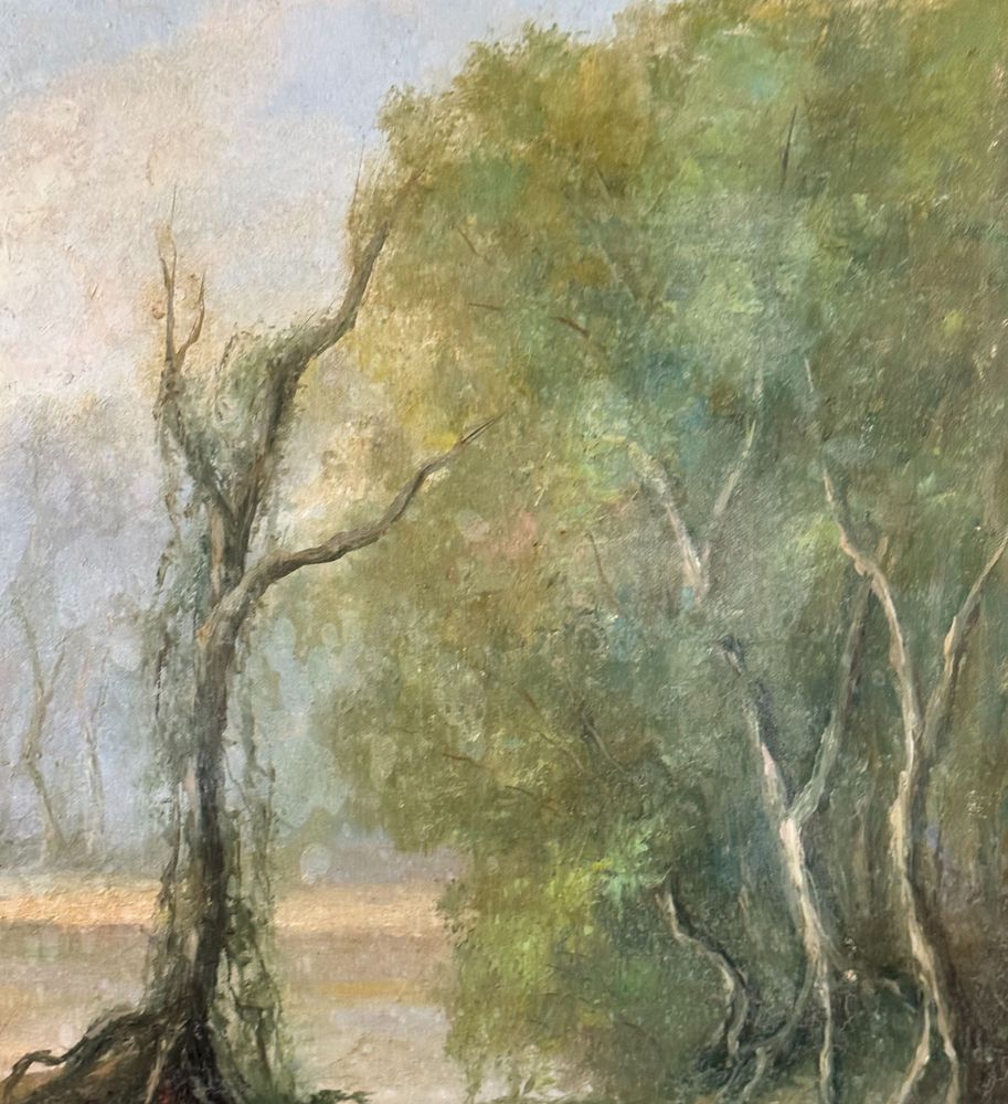 Dipinto olio su tela applicata su pannello, periodo XX secolo scuola Italiana, raffigurante Paesaggio con alberi e lago. Dimensioni compreso cornice: 79x66 cm. Dimensioni interno cornice: 70x56 cm. Reca firma in basso a destra da artista non identificato. Opera in buone condizioni.
