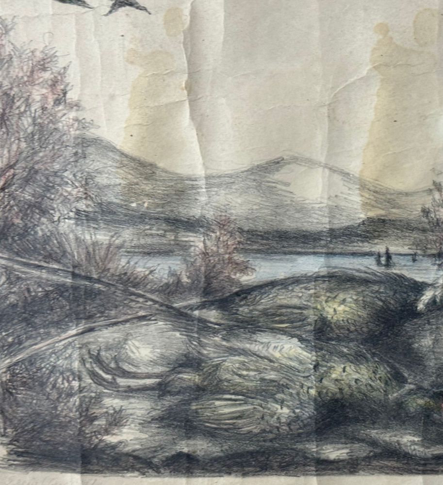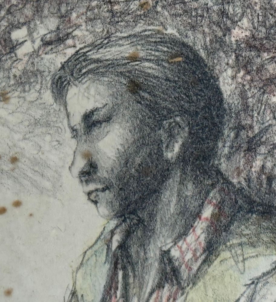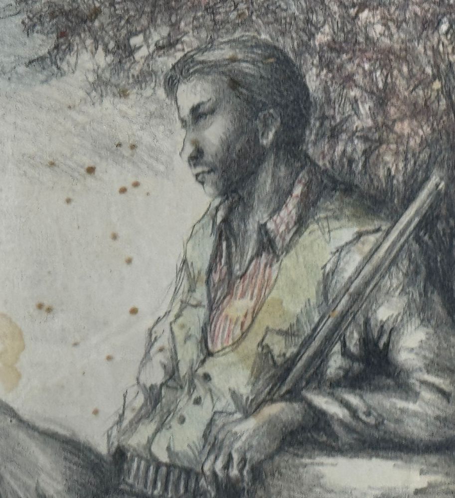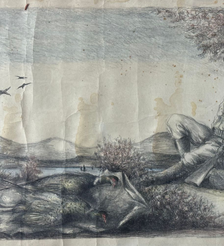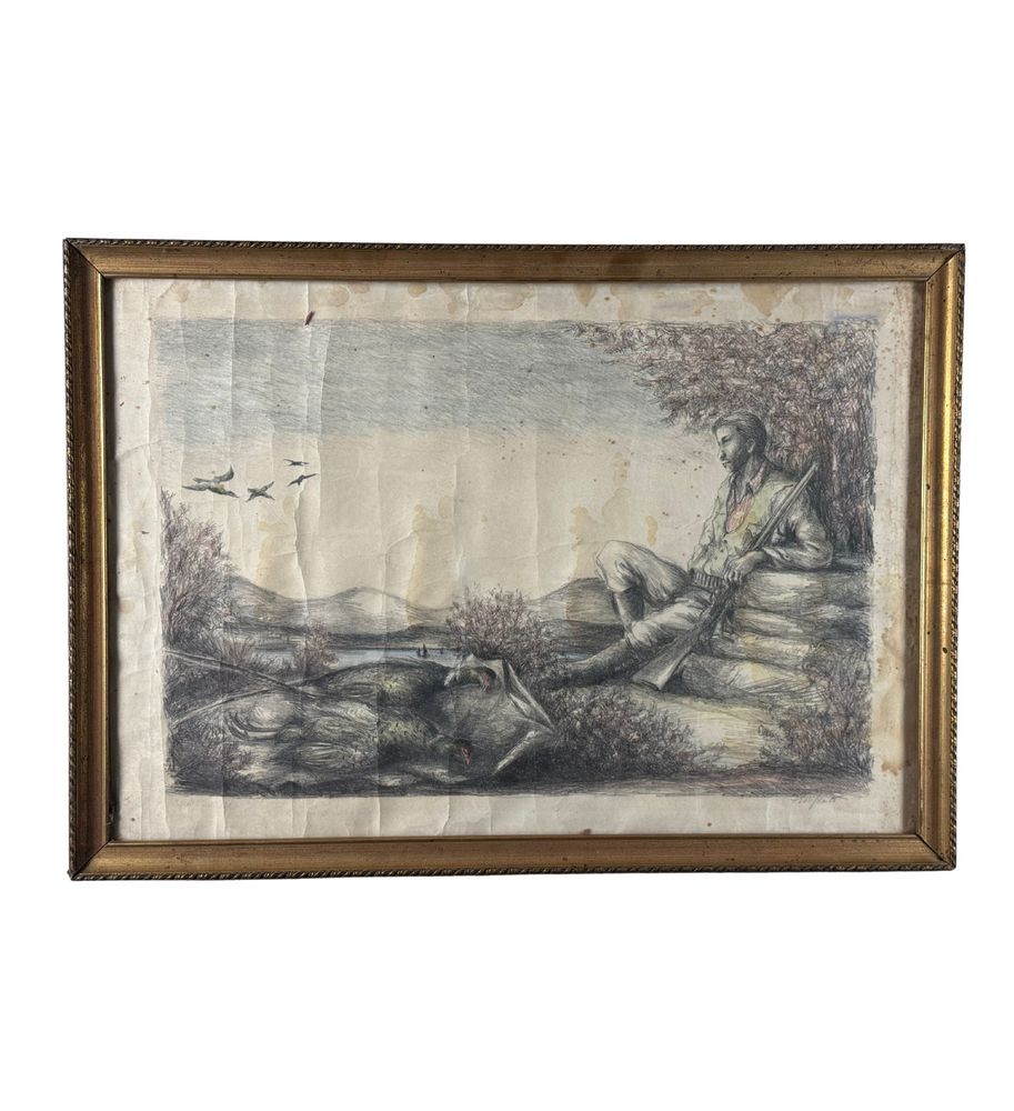 Disegno su carta, periodo XX secolo scuola Italiana, raffigurante Cacciatore a riposo. Dimensioni compreso cornice: 75x53 cm. Dimensioni interno cornice: 69x47 cm. Reca firma in basso a destra da artista non identificato. Opera in discrete condizioni con segni di vissuto e macchie.