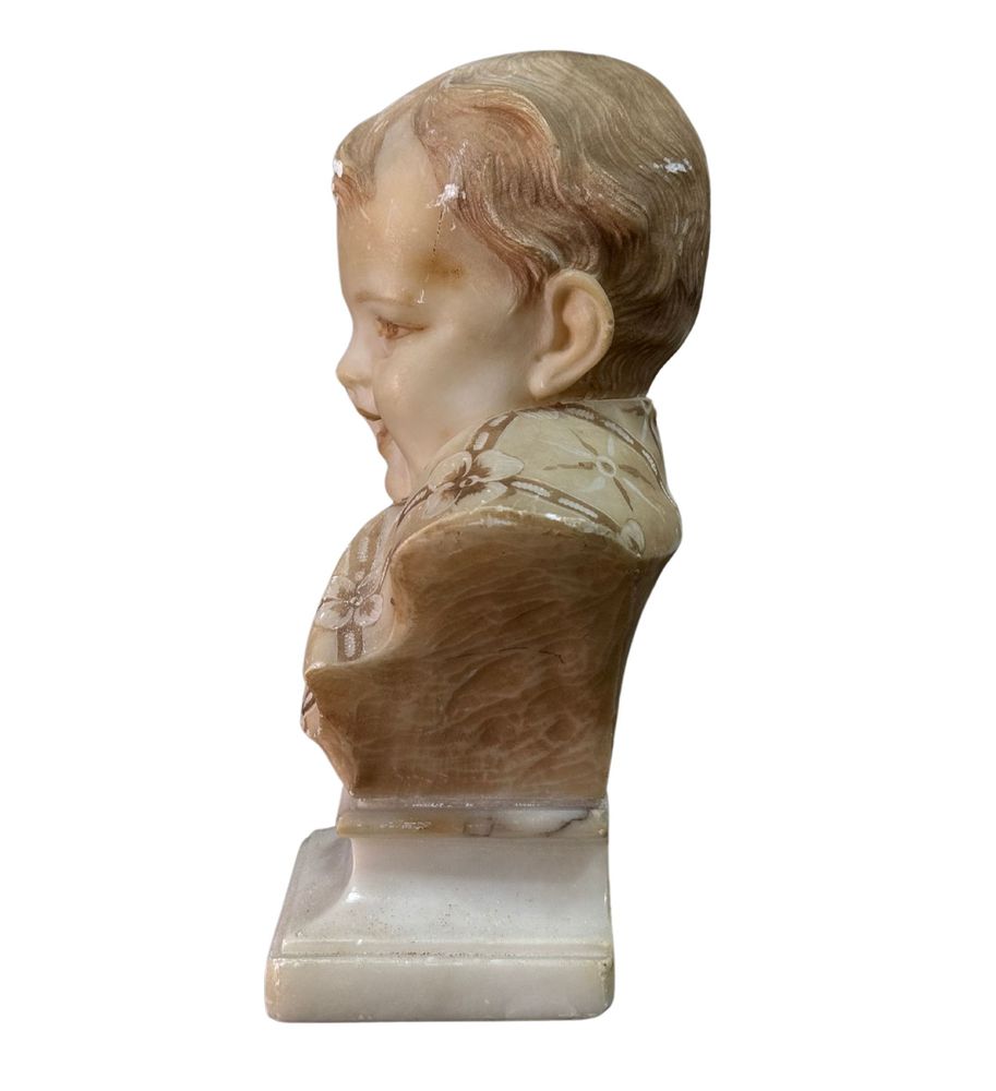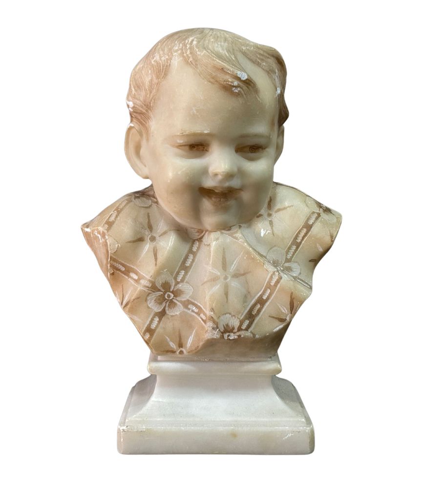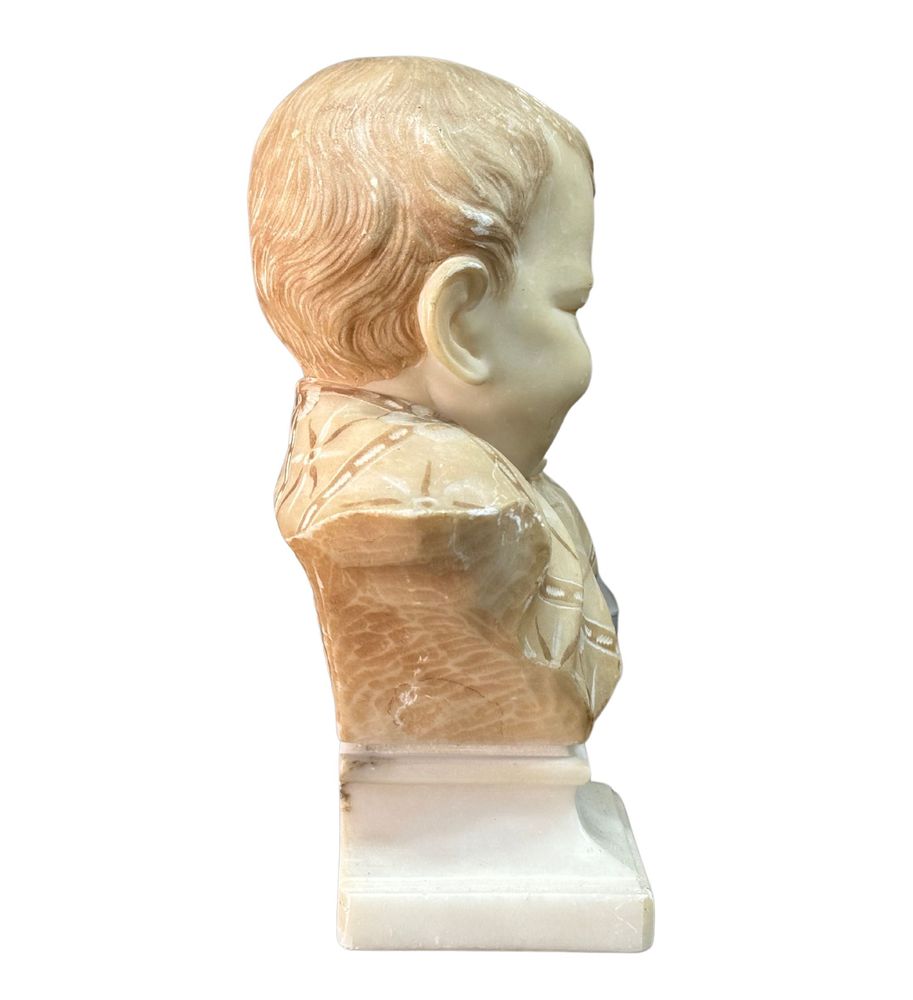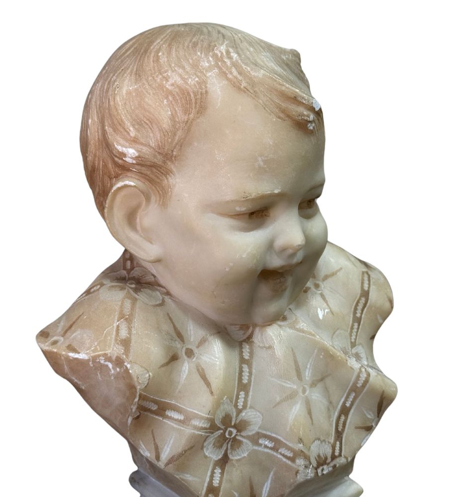 Scultura in marmo bianco di Carrara su base in marmo, periodo XX secolo, raffigurante Busto di Bambino. Dimensioni su base in marmo: h21x9x14 cm. Scultura in buone condizioni con lievi segni di vissuto come da foto allegate.