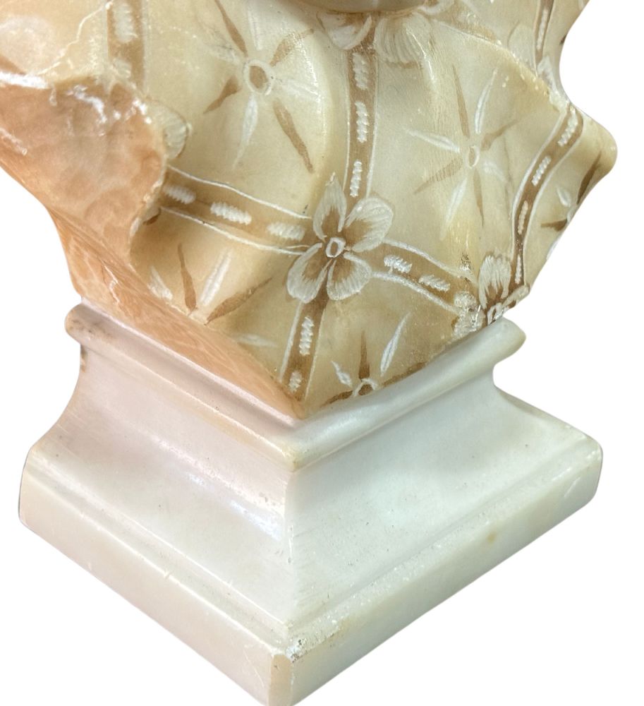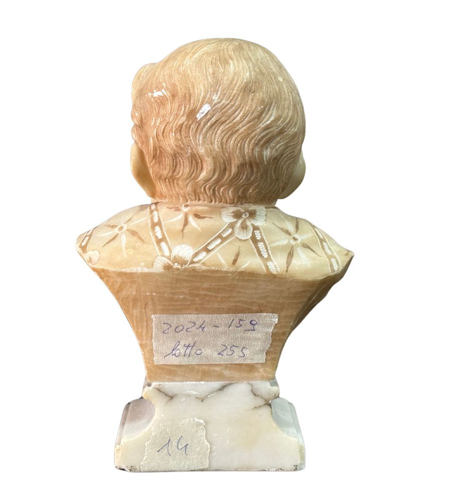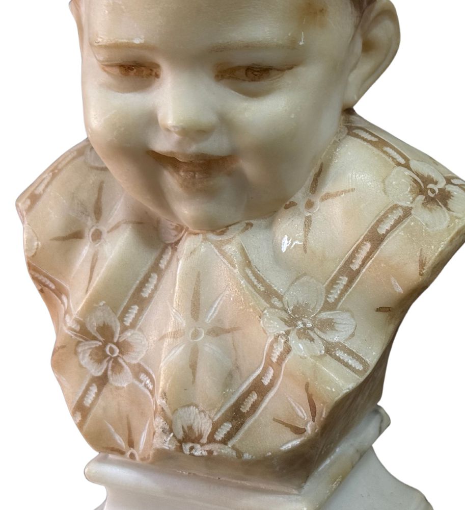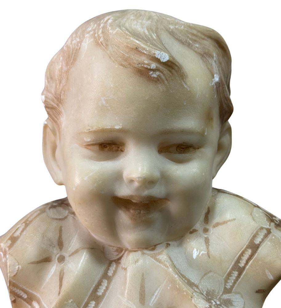 Scultura in marmo bianco di Carrara su base in marmo, periodo XX secolo, raffigurante Busto di Bambino. Dimensioni su base in marmo: h21x9x14 cm. Scultura in buone condizioni con lievi segni di vissuto come da foto allegate.