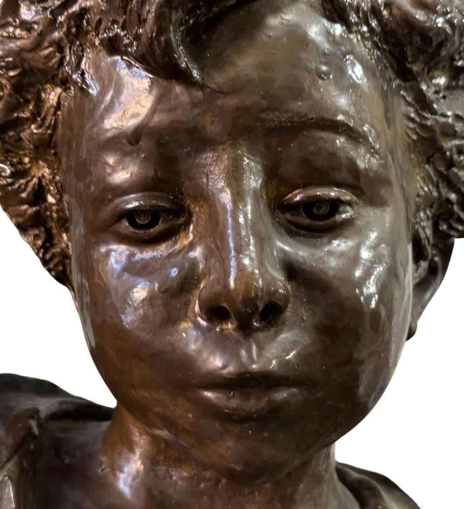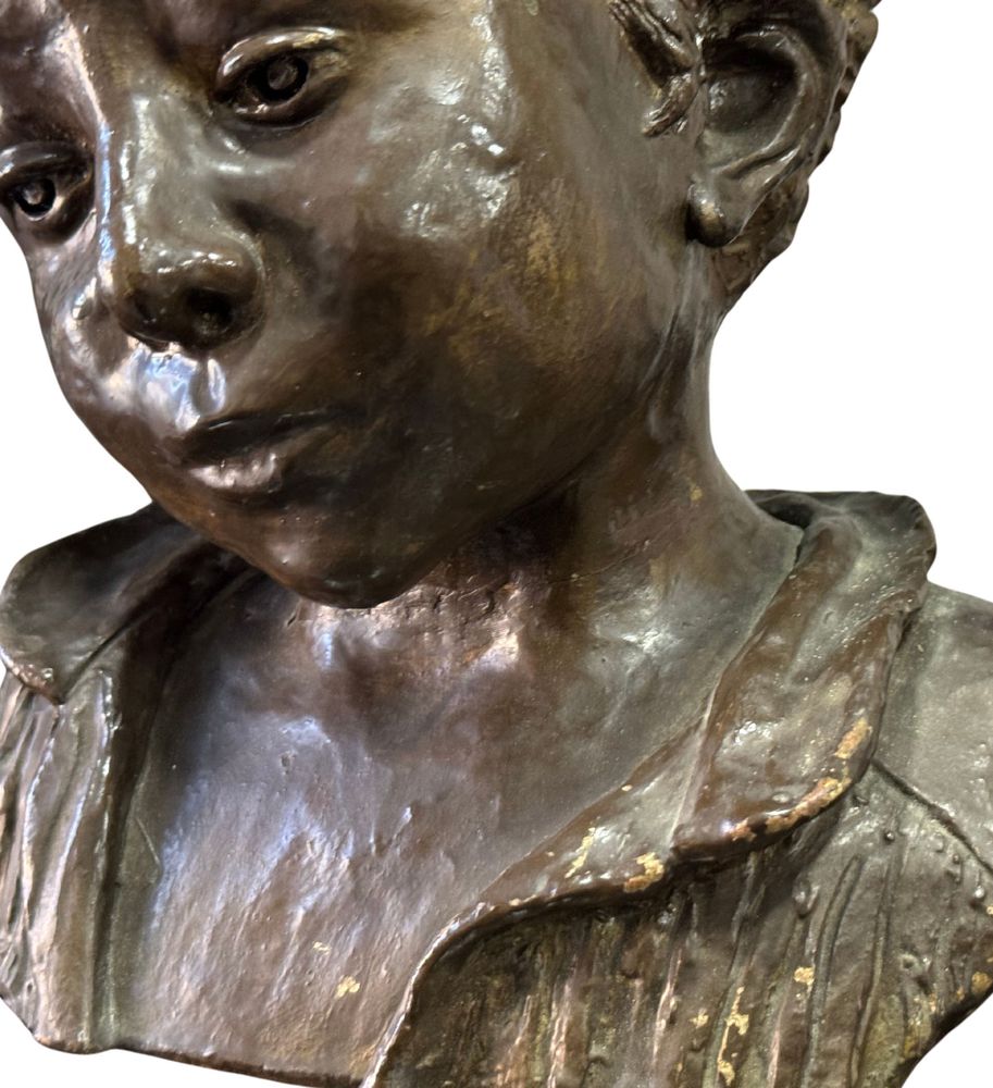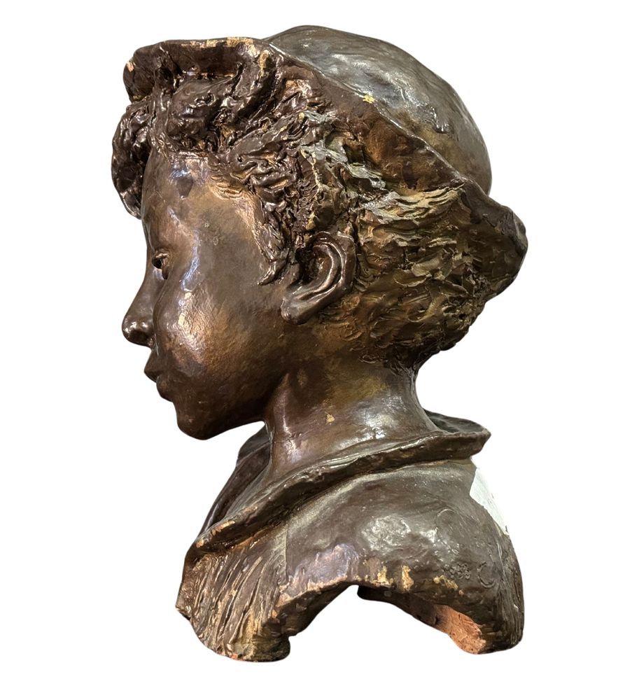 Scultura in terracotta, periodo XIX/XX secolo, raffigurante Busto di giovane. Dimensioni: h26x25x21 cm. Scultura in buone condizioni con lievi segni di vissuto come da foto allegate. Reca firma in basso a sinistra da artista non identificato.