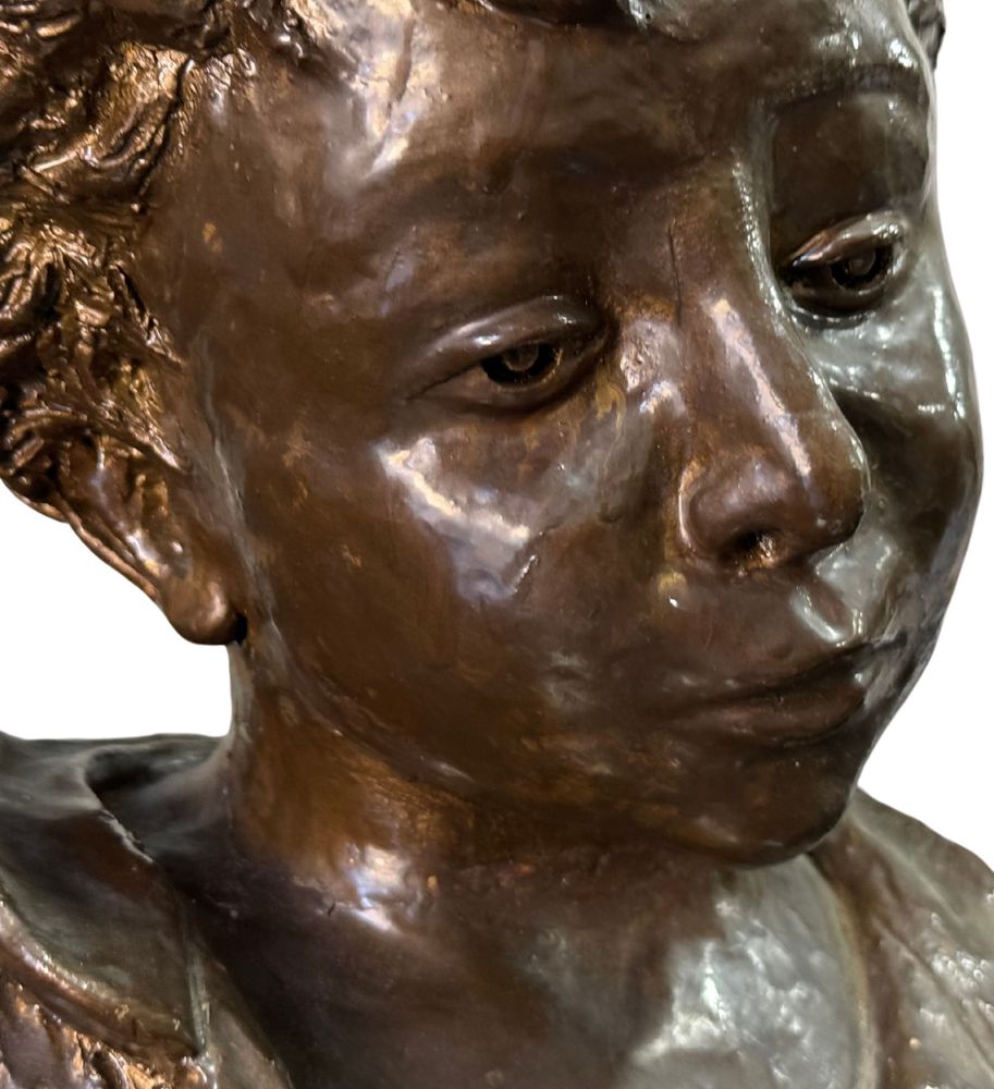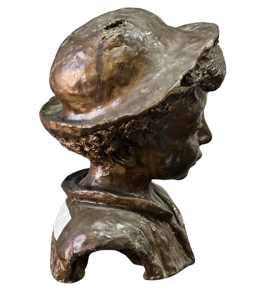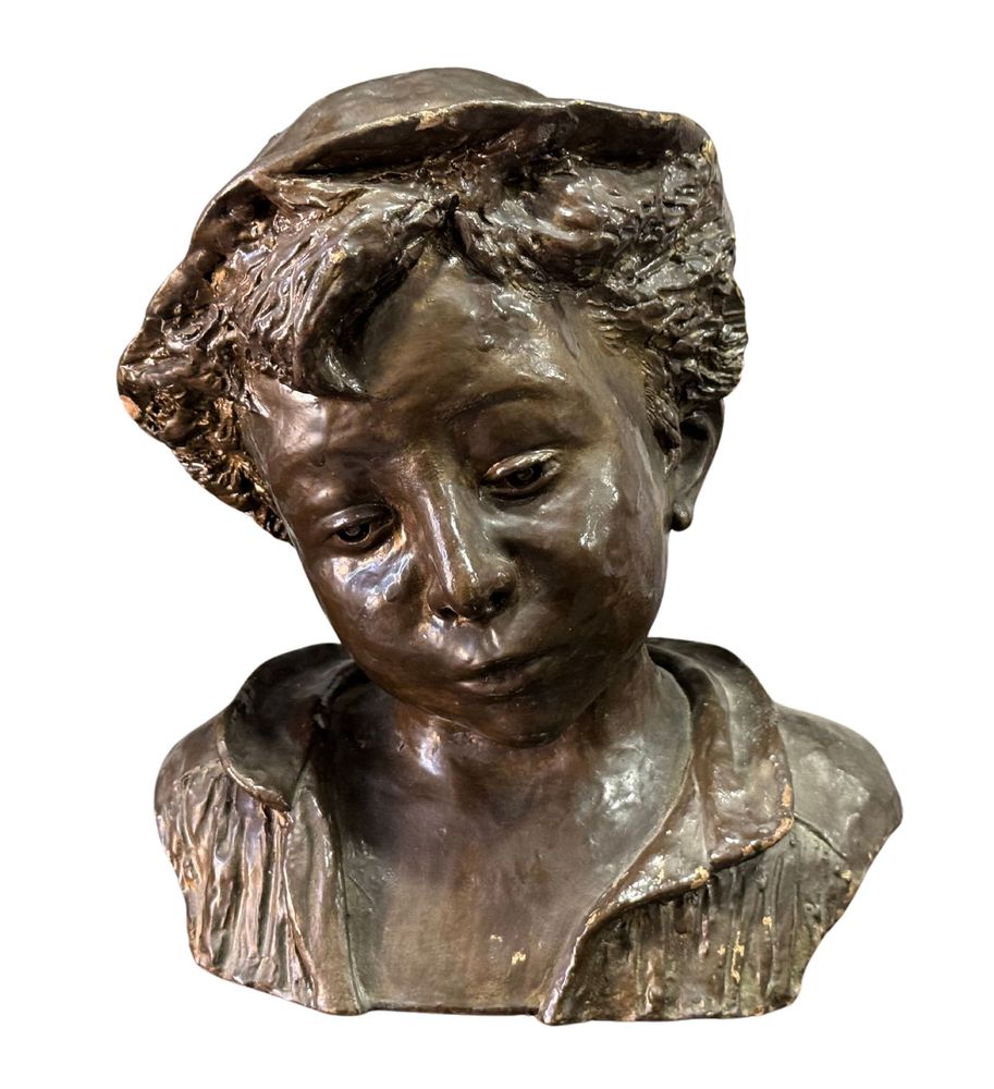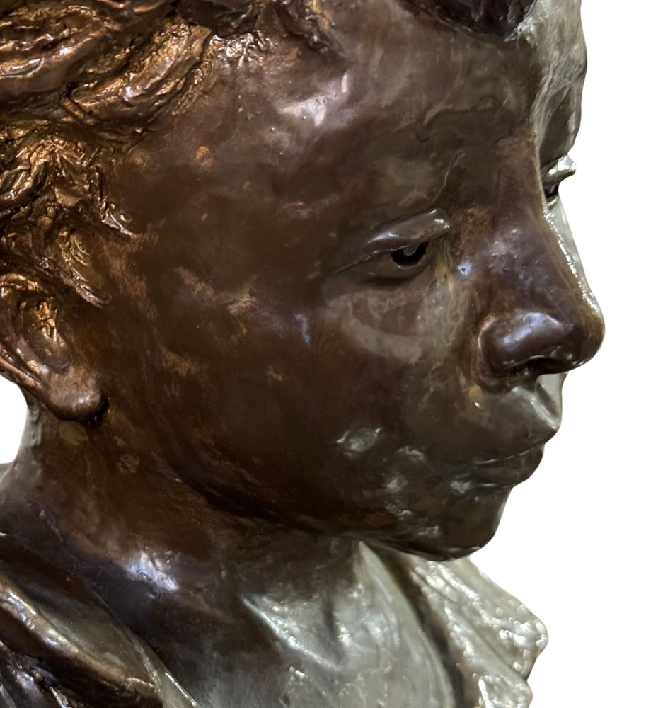 Scultura in terracotta, periodo XIX/XX secolo, raffigurante Busto di giovane. Dimensioni: h26x25x21 cm. Scultura in buone condizioni con lievi segni di vissuto come da foto allegate. Reca firma in basso a sinistra da artista non identificato.