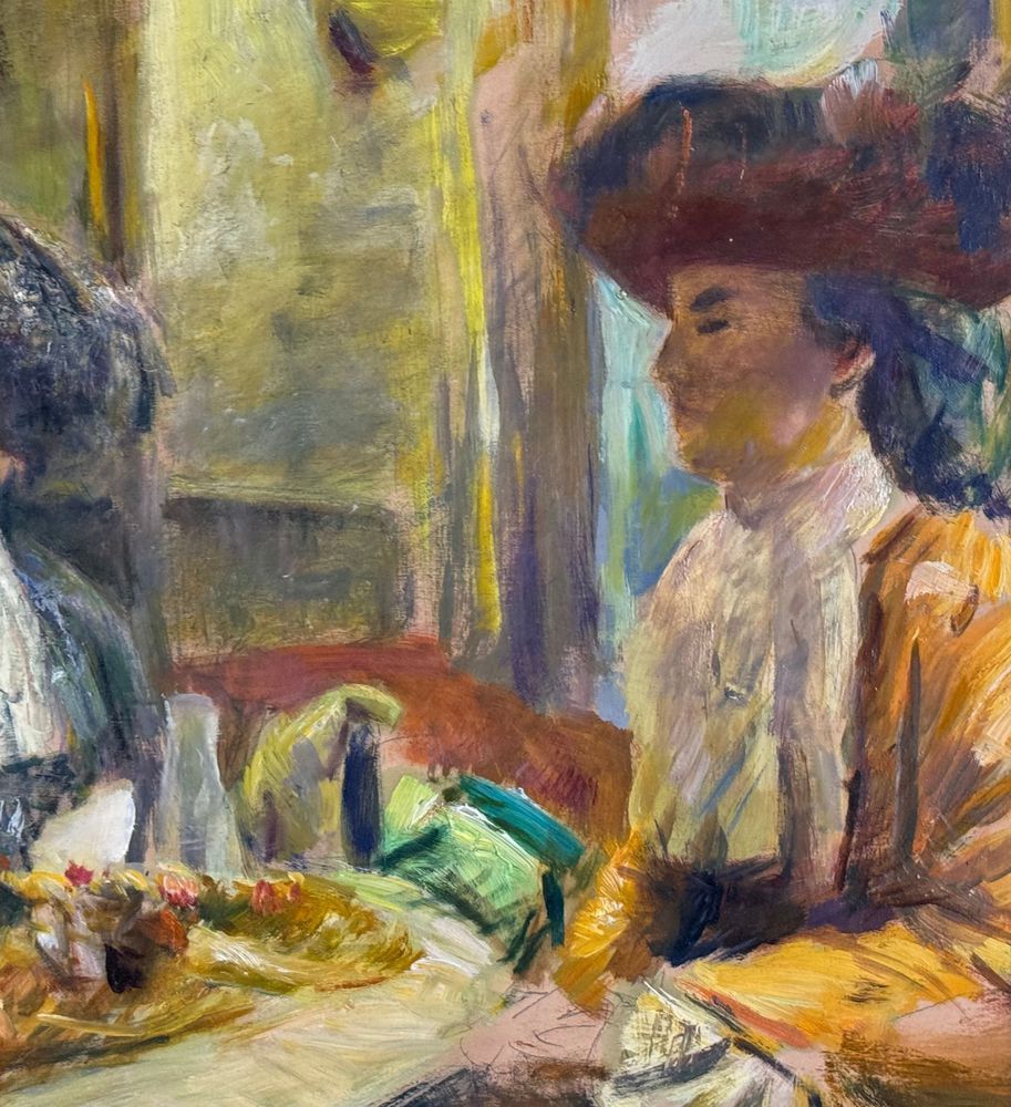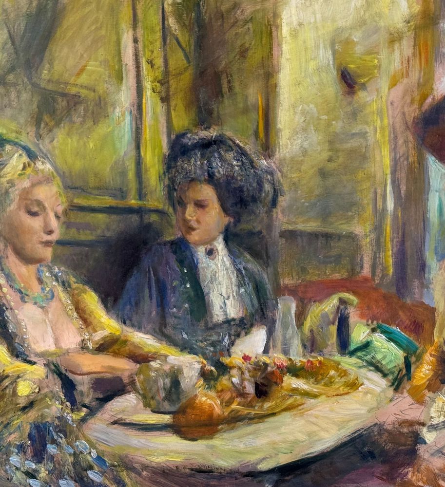 Dipinto olio su pannello, periodo XX secolo scuola Italiana, raffigurante Personaggi al bistrot. Dimensioni compreso cornice: 93x76 cm. Dimensioni interno cornice: 77x60 cm. Da artista anonimo. Opera in buone condizioni.