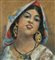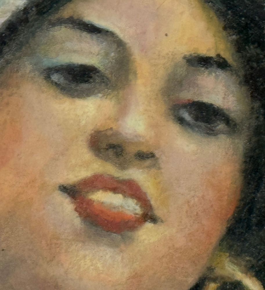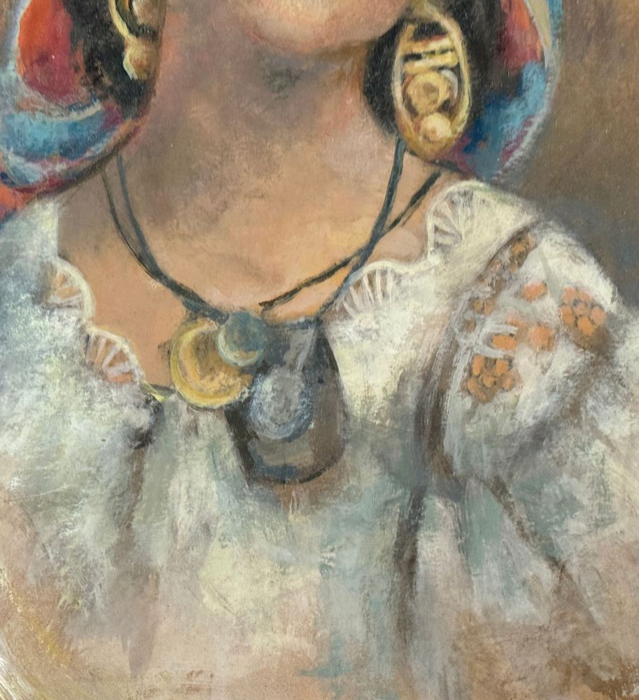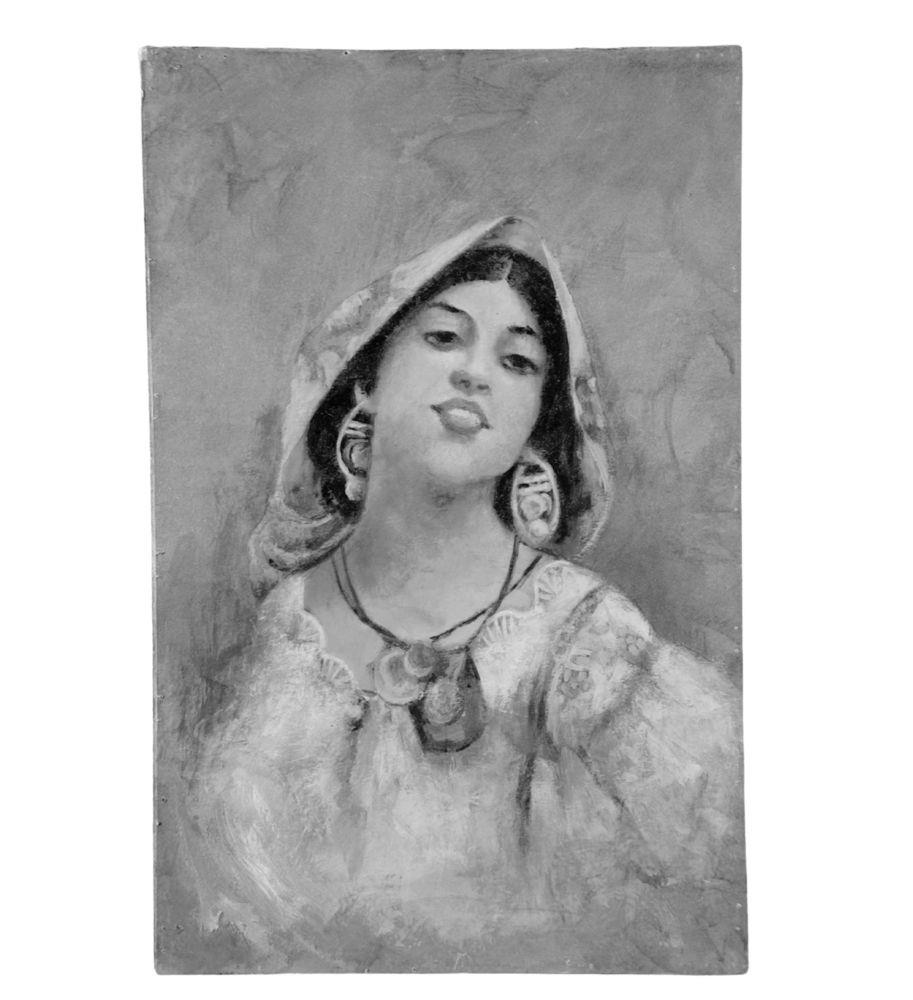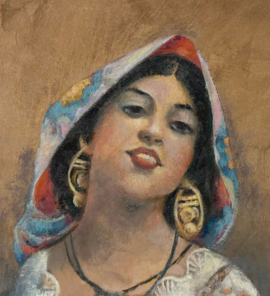 Dipinto olio su cartoncino, periodo XX secolo scuola Italiana, raffigurante Giovane donna con copricapo. Dimensioni: 48x31 cm. Da artista anonimo. Opera in buone condizioni.
