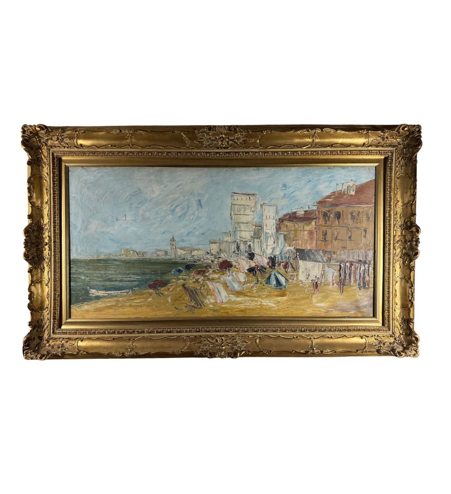Dipinto olio su tela, periodo XX secolo scuola Italiana, raffigurante Marina con personaggi. Dimensioni compreso cornice: 150x90 cm. Dimensioni interno cornice: 120x60 cm. Da artista anonimo. Opera in buone condizioni. Da segnalare un taglio di circa 4 cm nella parte alta sinistra della tela.