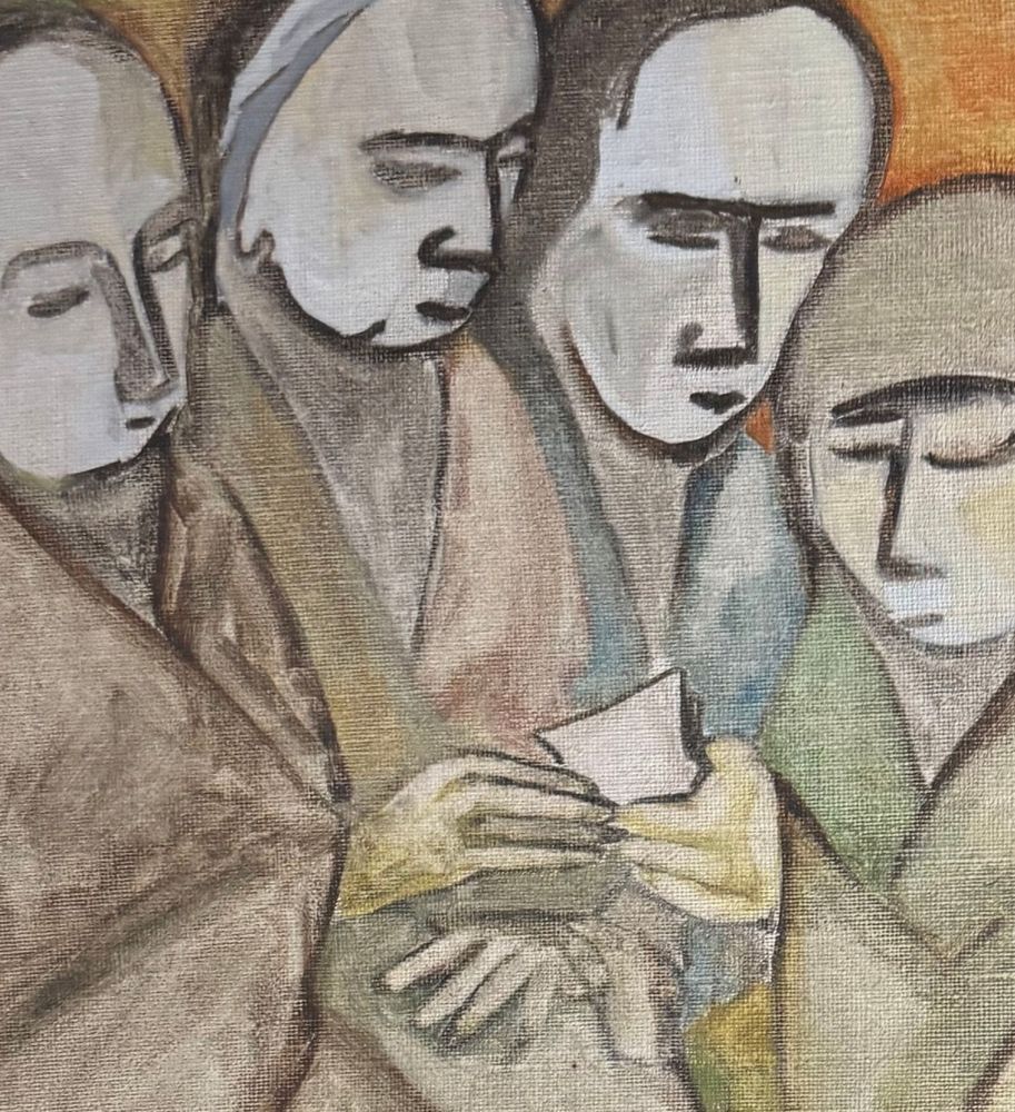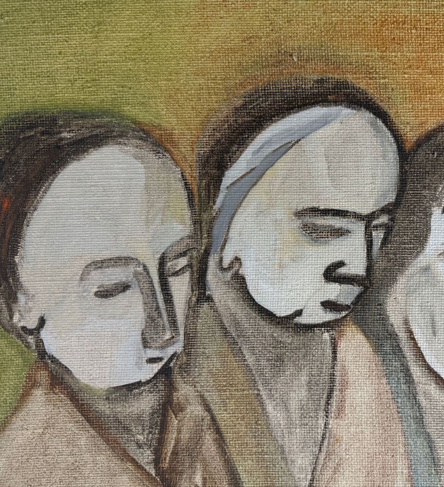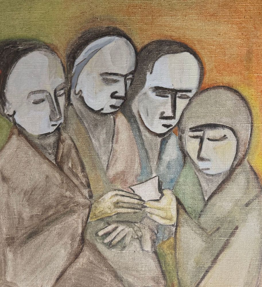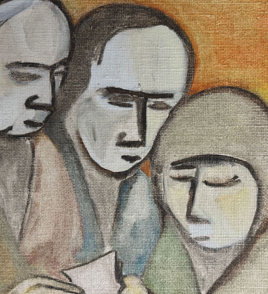 Dipinto olio su tela, periodo XX secolo scuola Italiana, raffigurante Quattro personaggi. Dimensioni compreso cornice: 92x123 cm. Dimensioni interno cornice: 71x100 cm. Da artista anonimo. Opera in buone condizioni.