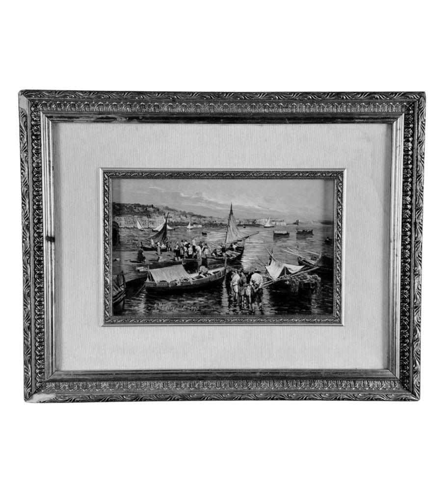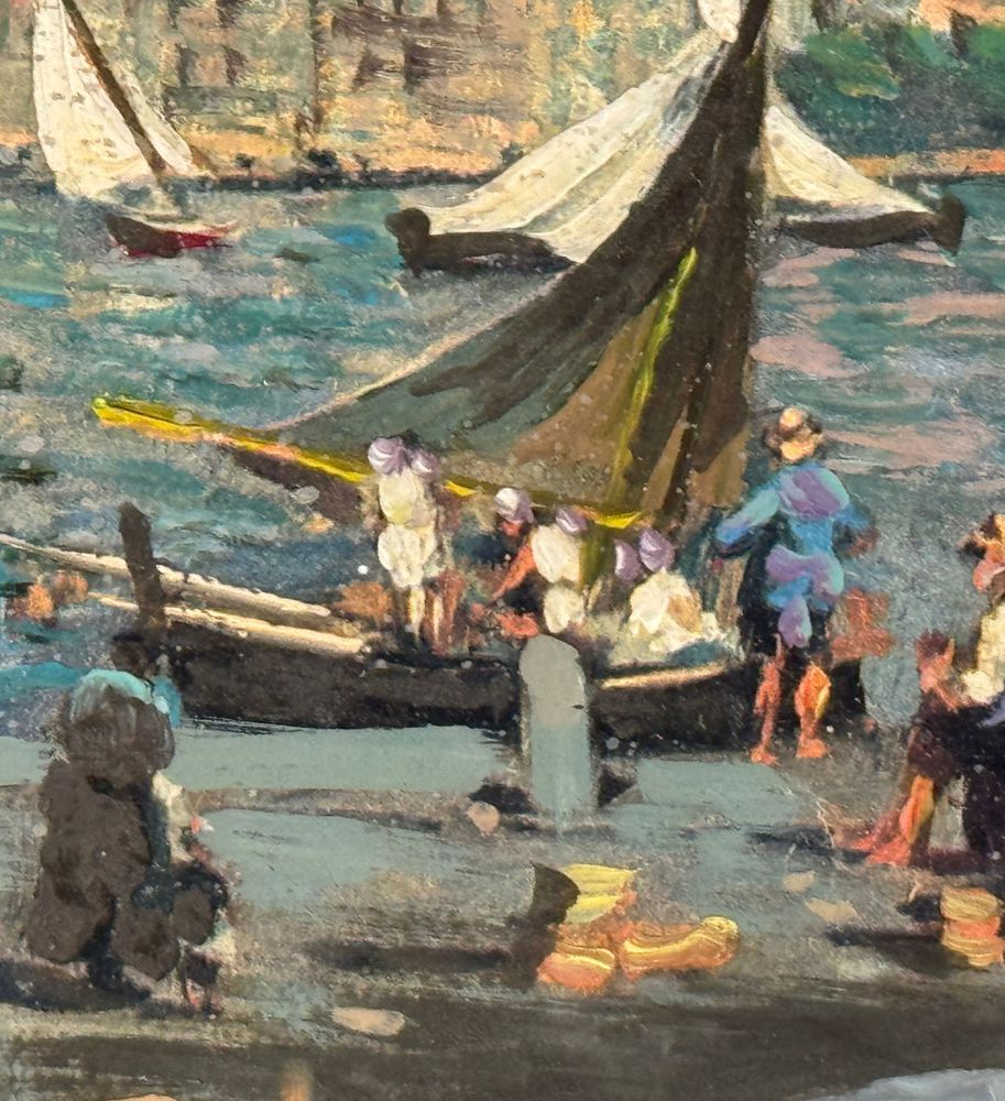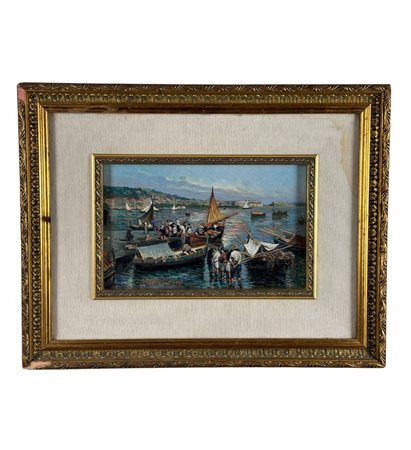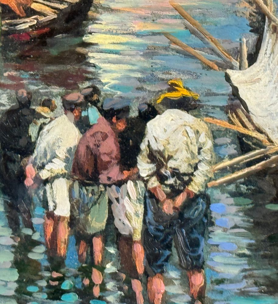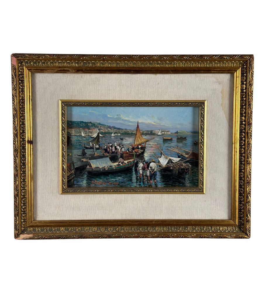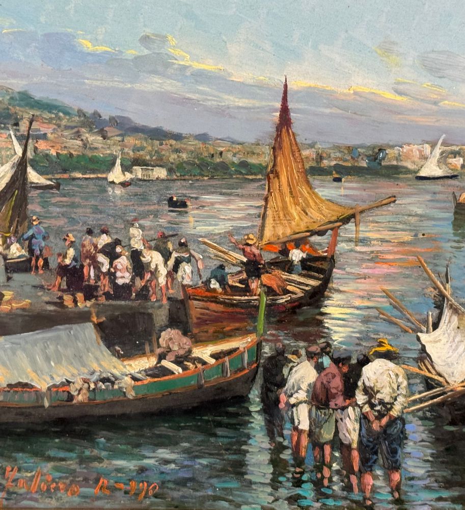 Dipinto olio su pannello, periodo XX secolo scuola Italiana, raffigurante Scorcio di marina con barche e pescatori. Dimensioni compreso cornice: 54x42 cm. Dimensioni interno cornice: 32,5x20 cm. Reca firma in basso a destra da Salvatore Faliero. Opera in buone condizioni.