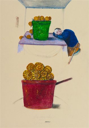 Antonio Possenti (Lucca 1933) LUMACHE AL TEGAME Tecnica mista su cartoncino,...