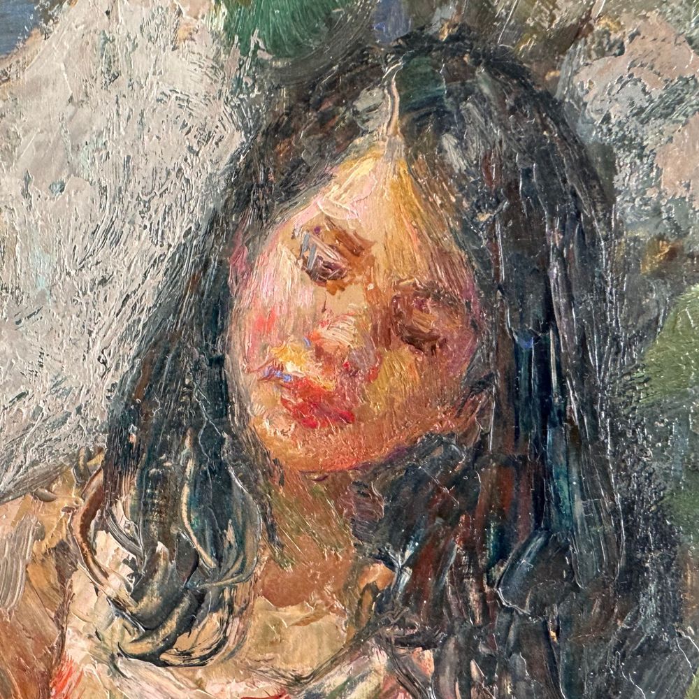 Dipinto olio su pannello, periodo XX secolo scuola italiana, raffigurante Scena con tre personaggi in giardino. Dimensioni interno cornice: 48x40 cm. Reca firma in basso a destra da artista non identificato.