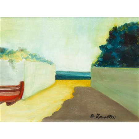 Aldo Zanetti (Catania 1944) - Strada che porta al mare, 1982 h cm 20X26 in cornice 38X42 olio su tela Firmato in basso a destra
