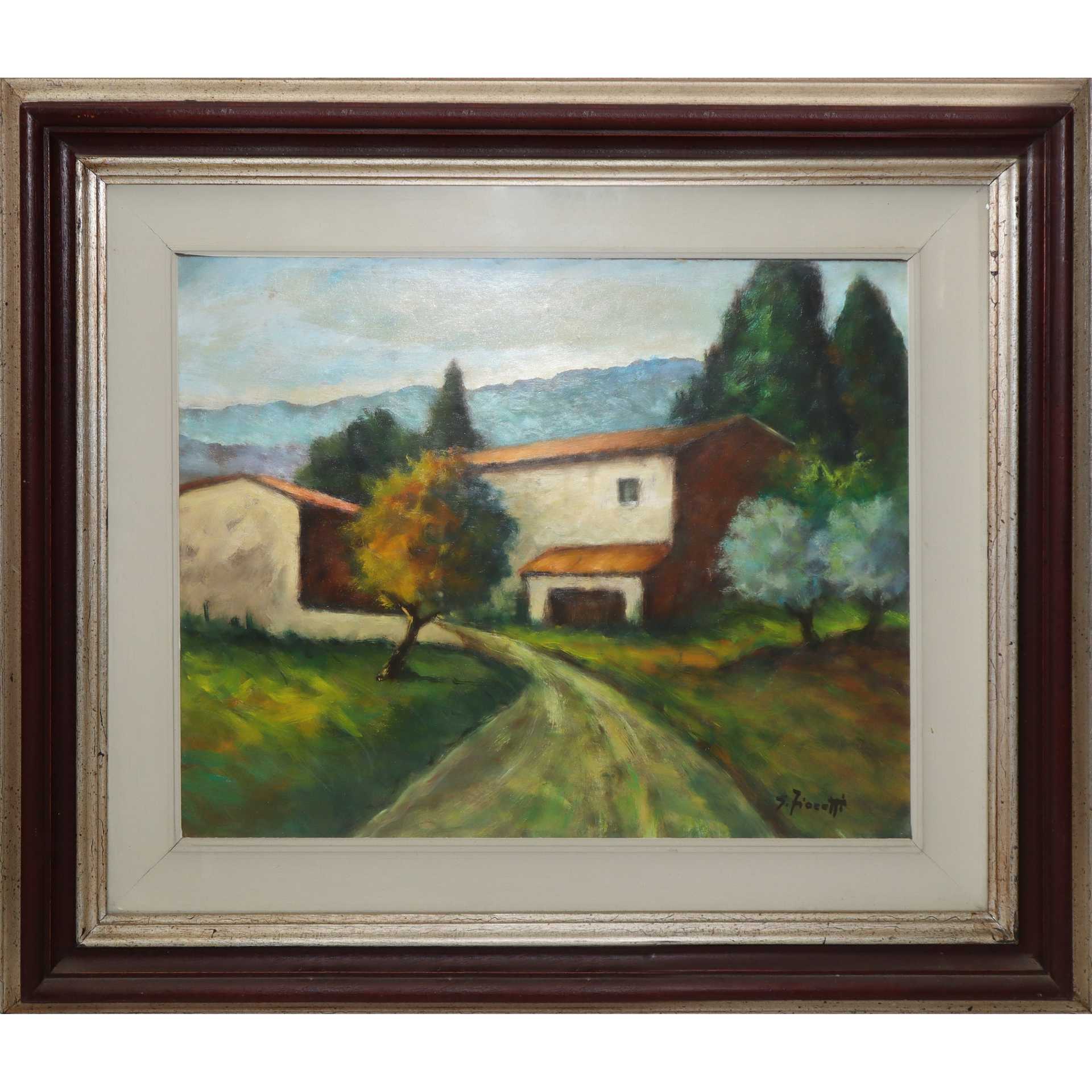 Giancarlo Fioretti (Firenze 1957) - Case con alberi cm 40x50, in cornice 63x73 Olio su cartone Firmato in basso a destra G. Fioretti.